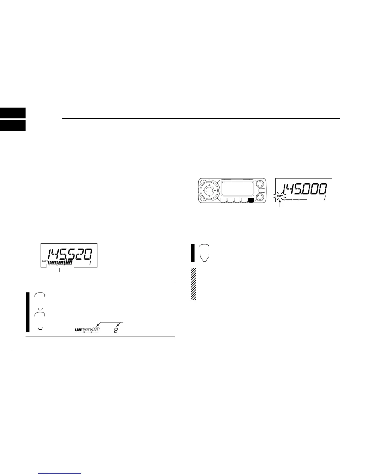 • “VOL” for audio or “SQL” for squelch appears during set.