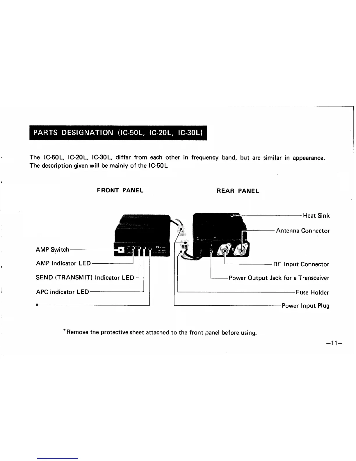 Icom IC-20L - Linear Amplifier Parts Identification; Linear Amplifier Front;Rear Panel Layout