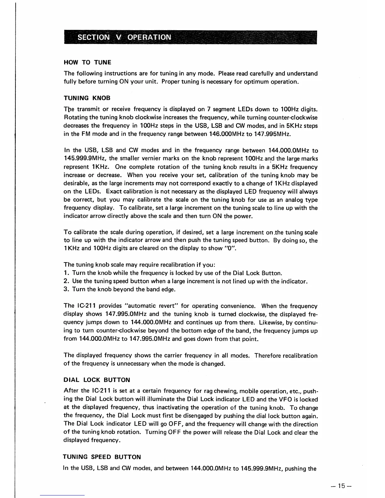 Icom IC-211 - SECTION V OPERATION; HOW TO TUNE