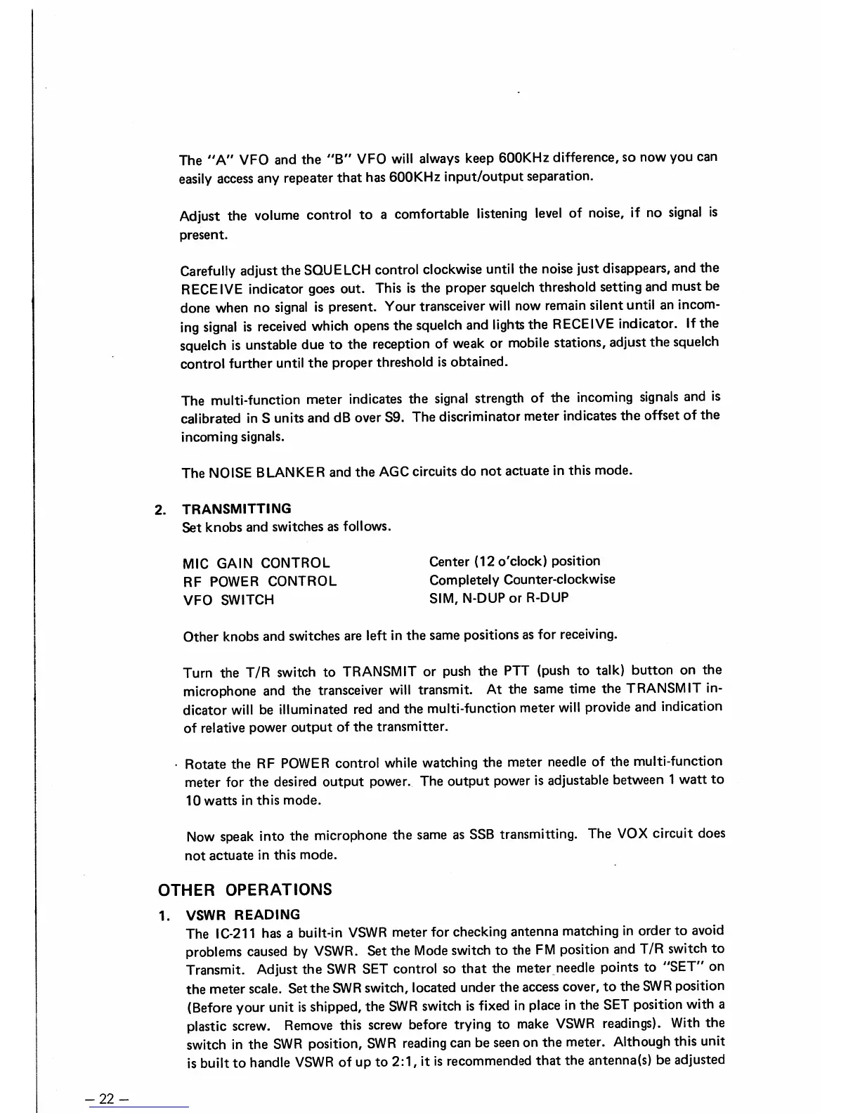 Icom IC-211 - OTHER OPERATIONS; VSWR READING