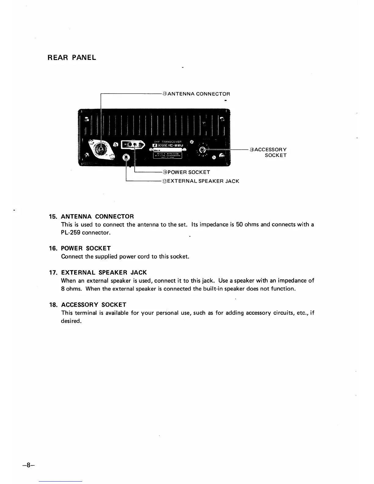 Icom IC-22U - REAR PANEL CONNECTORS; ANTENNA CONNECTOR; POWER SOCKET; EXTERNAL SPEAKER JACK