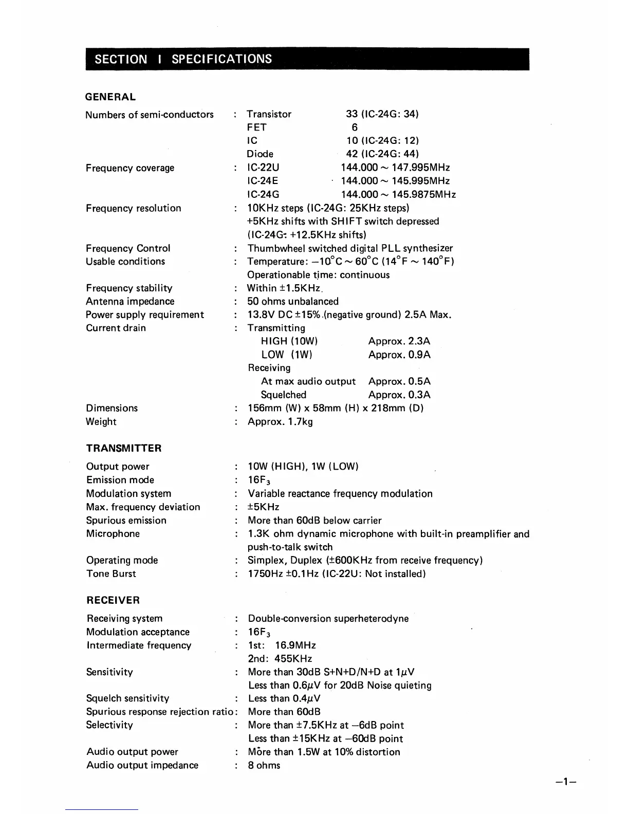 Icom IC-22U - SECTION I SPECIFICATIONS; GENERAL SPECIFICATIONS; TRANSMITTER SPECIFICATIONS; RECEIVER SPECIFICATIONS