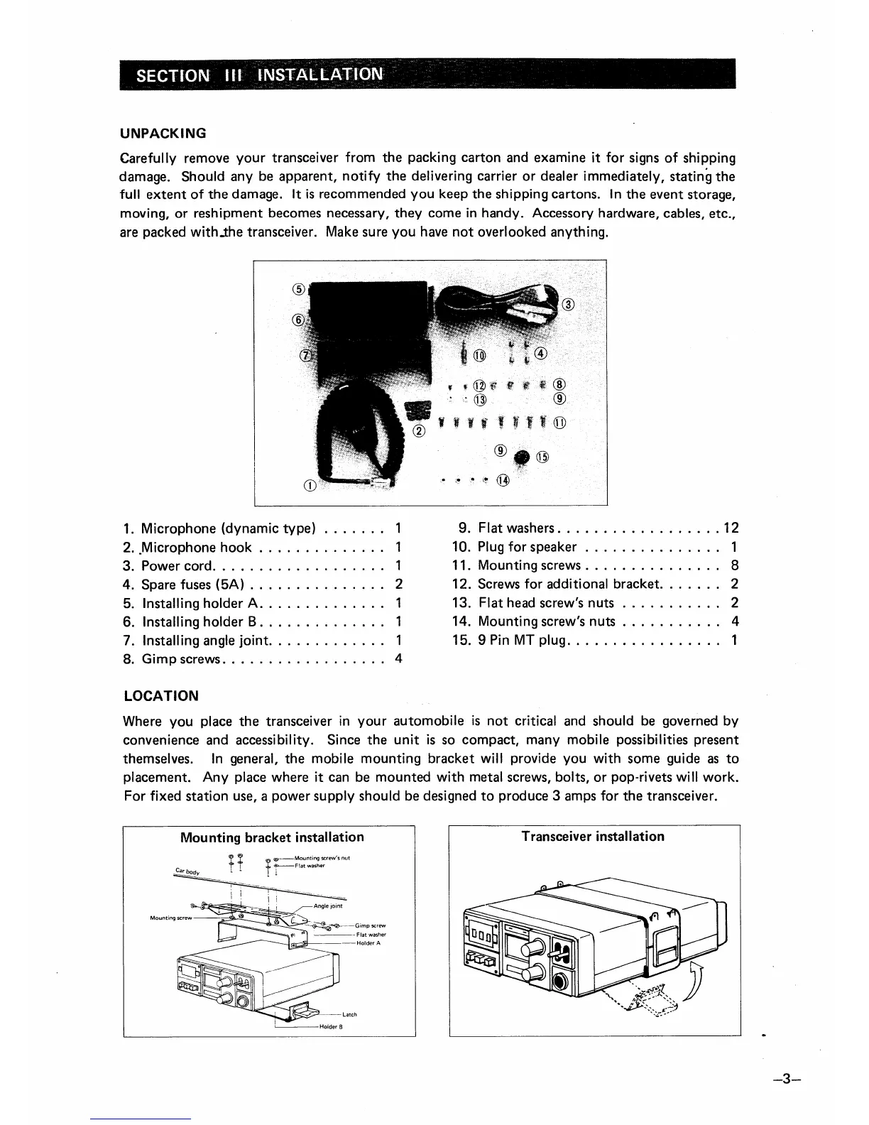 Icom IC-22U - SECTION III INSTALLATION; UNPACKING AND INSPECTION; LOCATION AND MOUNTING