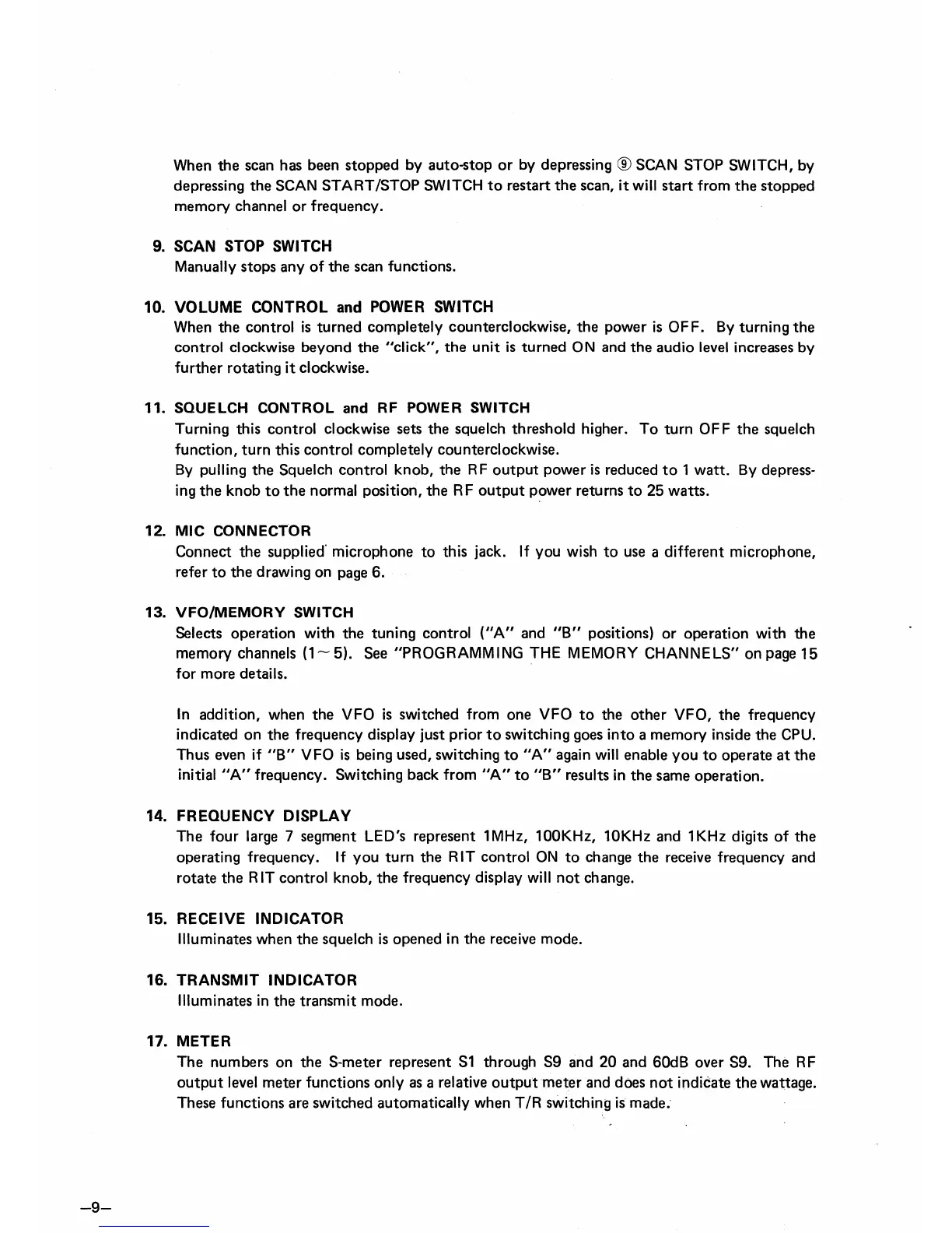 Icom IC-255A - Volume, Squelch, and Power Controls; VFO;Memory Switch and Indicators