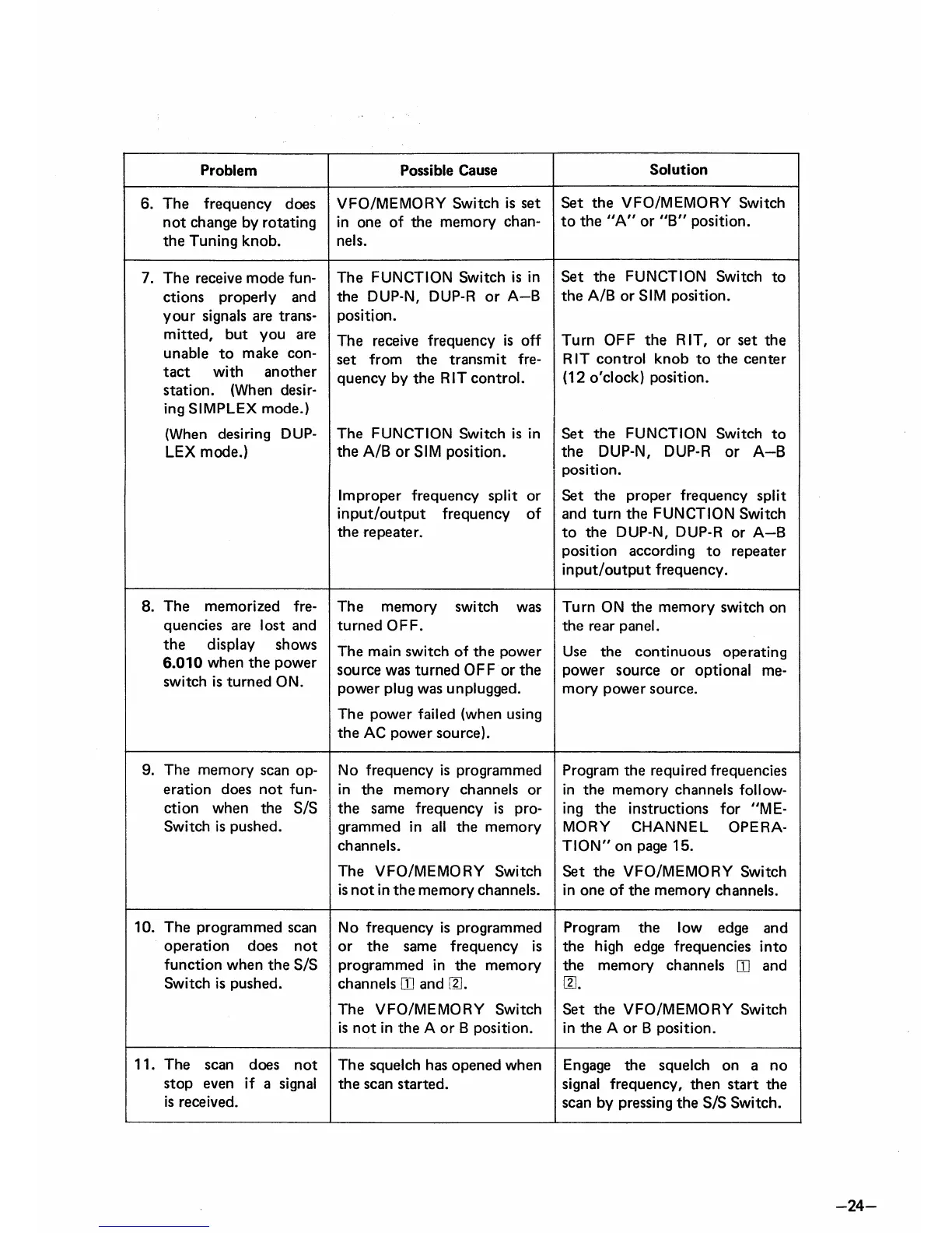 Icom IC-255A - Frequency, Tuning, and Contact Issues; Memory, Scan, and Mode Operation Problems