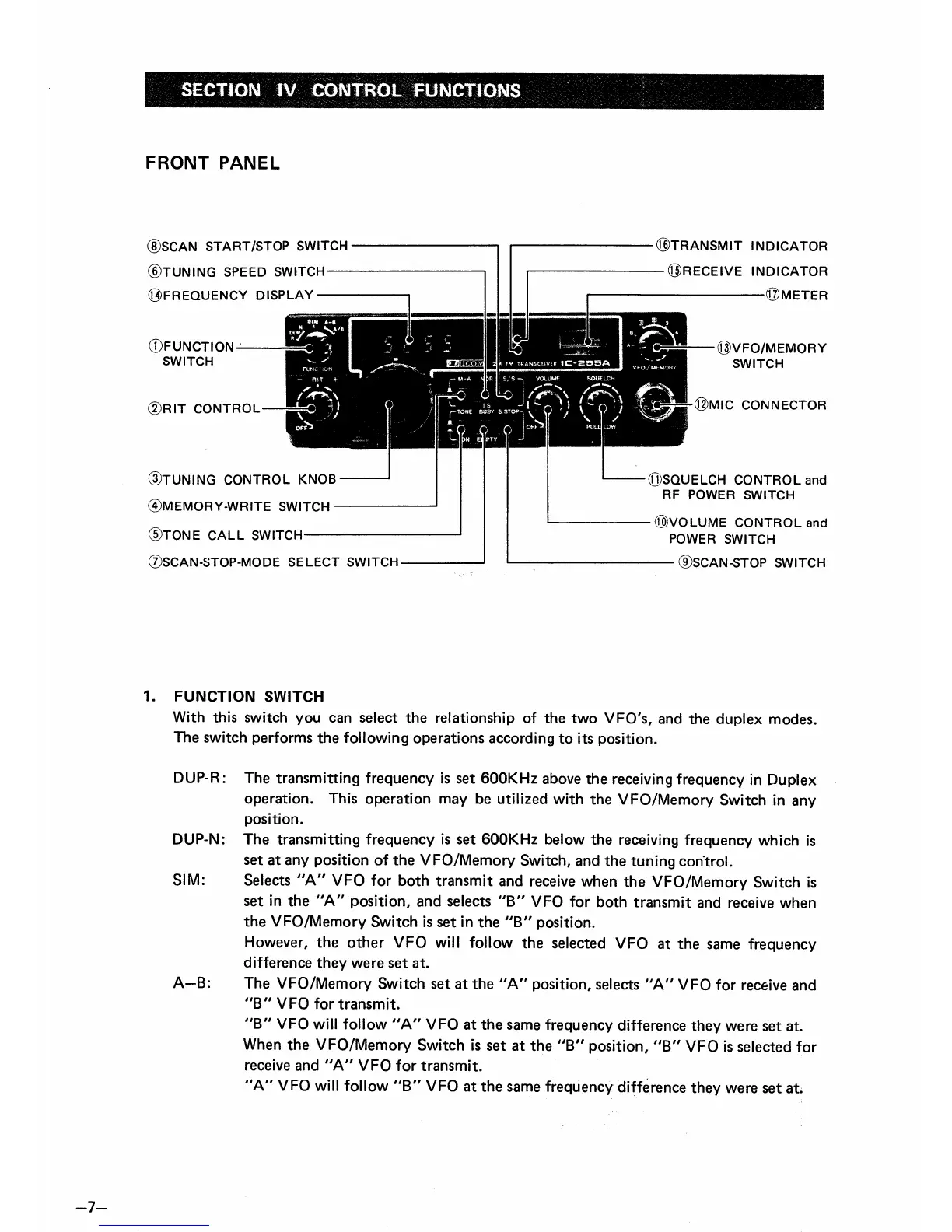 Icom IC-255A - Front Panel Controls and Functions; Front Panel Controls Overview; Function Switch Modes