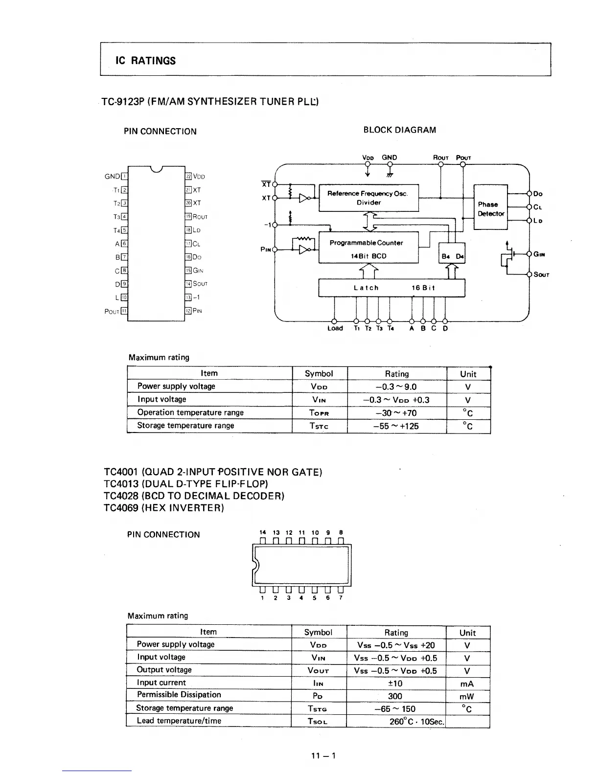 Icom IC-25E - IC Ratings; TC-9123 P (FM;AM Synthesizer Tuner PLL); Pin Connection; Maximum Rating