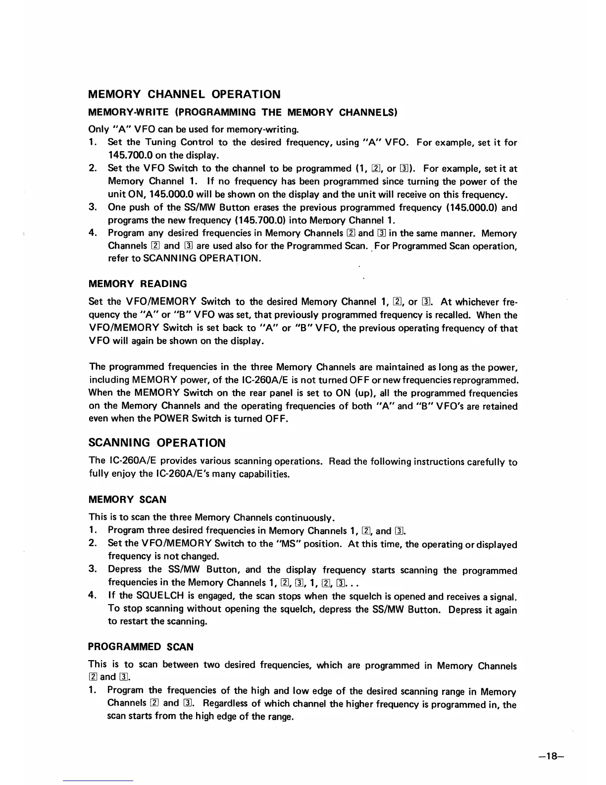 Icom IC-260A - Memory Channel Operation; Memory-Write; Memory Reading; Scanning Operation