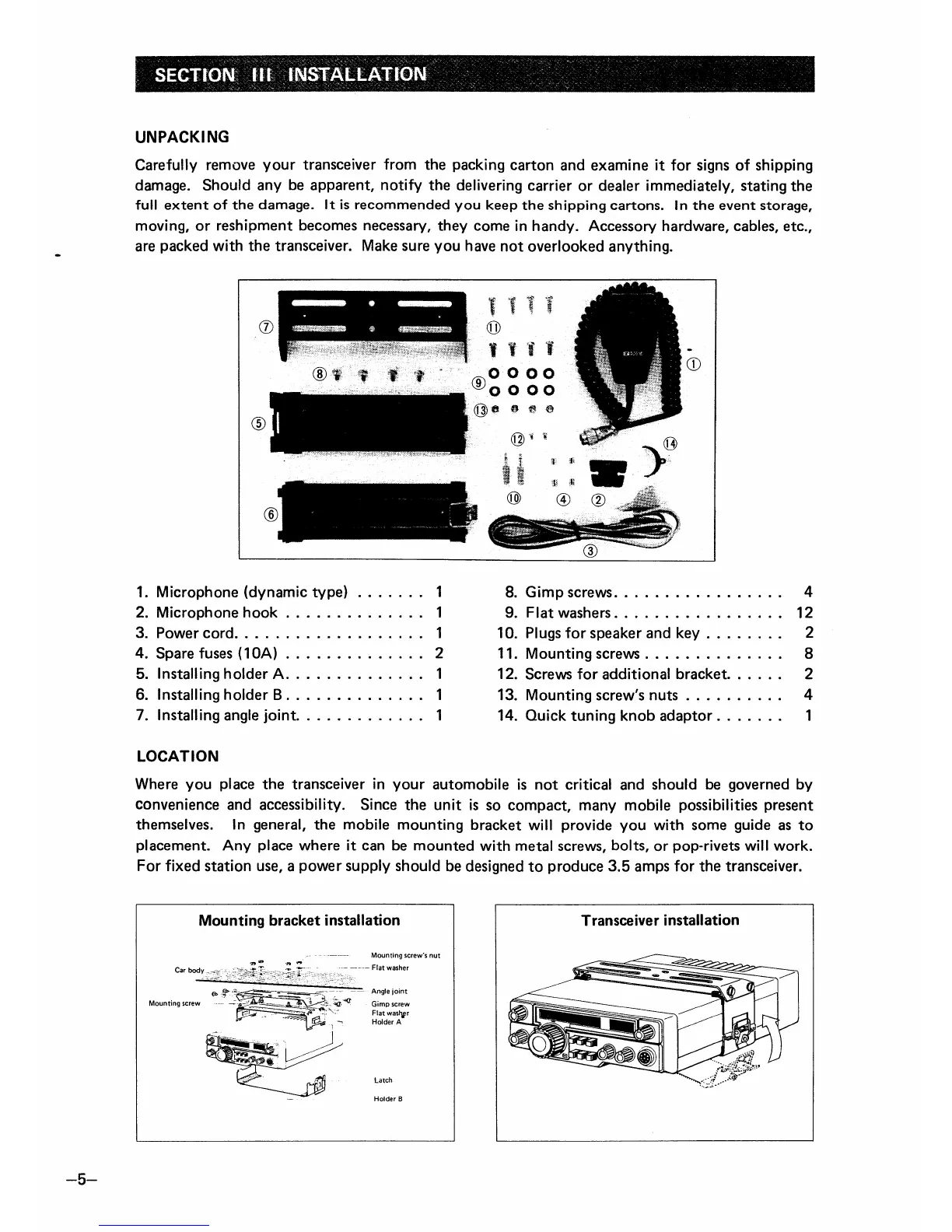 Icom IC-260A - Installation; Unpacking; Location; Mounting Bracket Installation
