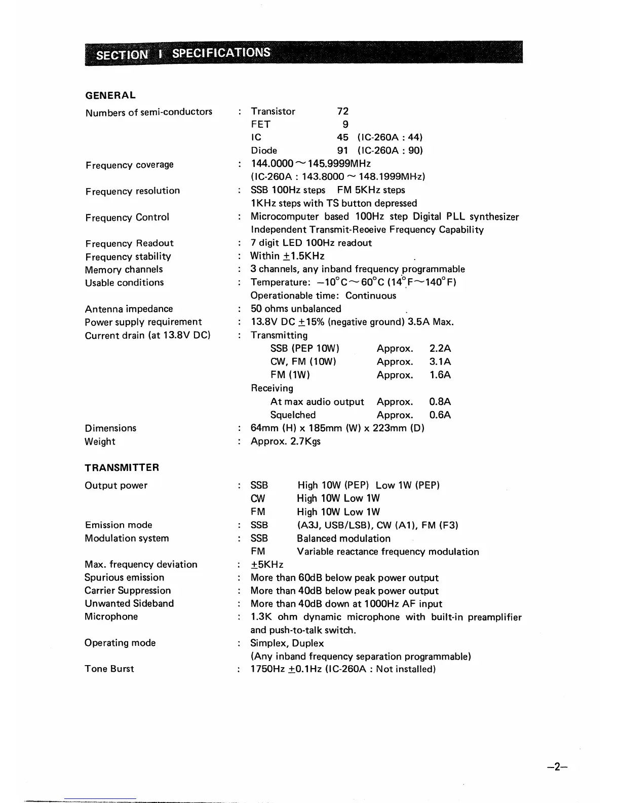 Icom IC-260E - Section I Specifications; General Specifications; Transmitter Specifications; Receiver Specifications