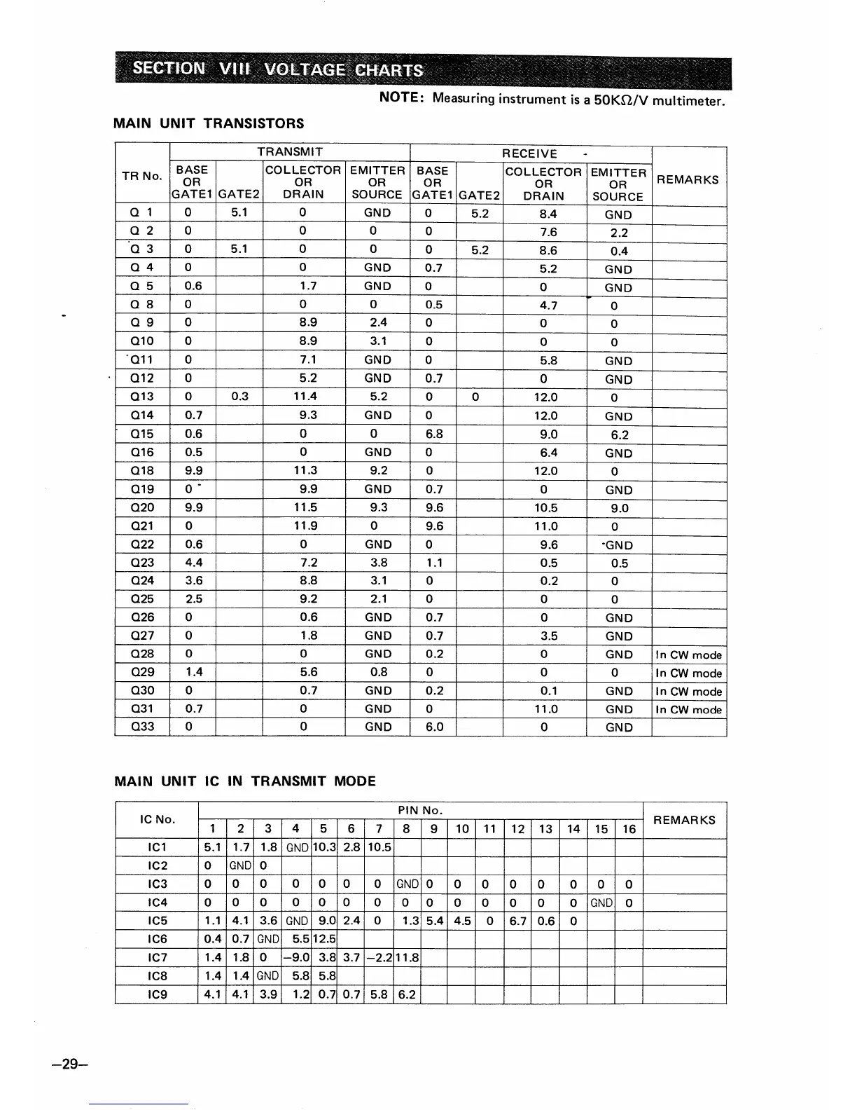 Icom IC-260E - Section VIII Voltage Charts; Unit Transistor and IC Voltage Readings