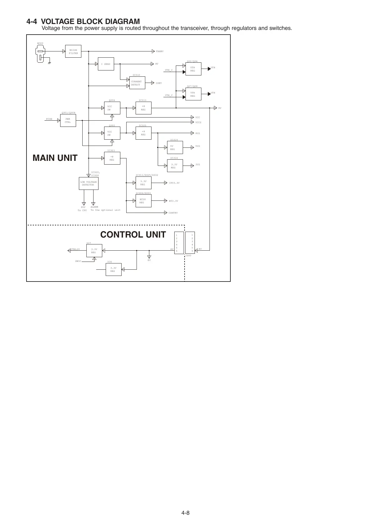 Voltage from the power supply is routed throughout the transceiver, through regulators and switches.