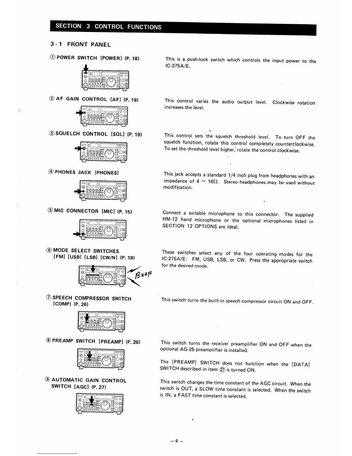 Icom IC-275A - SECTION 3 CONTROL FUNCTIONS; FRONT PANEL CONTROLS AND INDICATORS