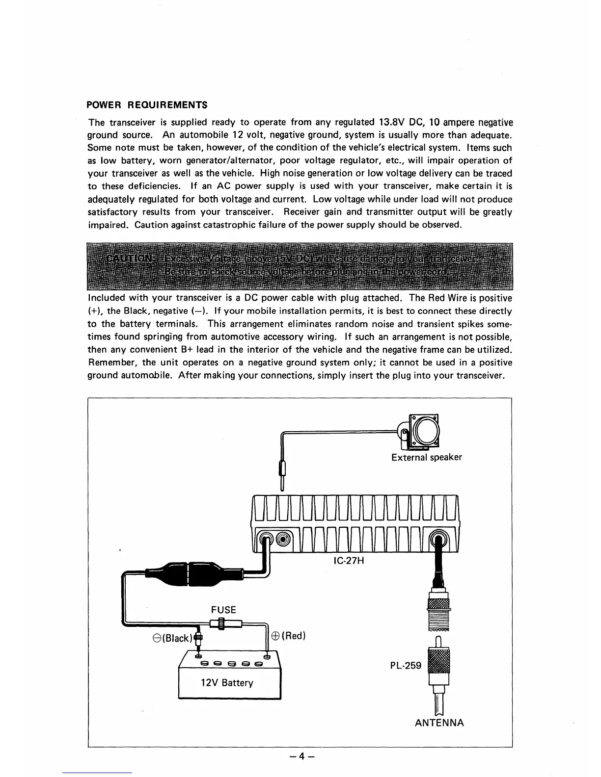 Icom IC-27H - POWER REQUIREMENTS; POWER CONNECTION AND REQUIREMENTS