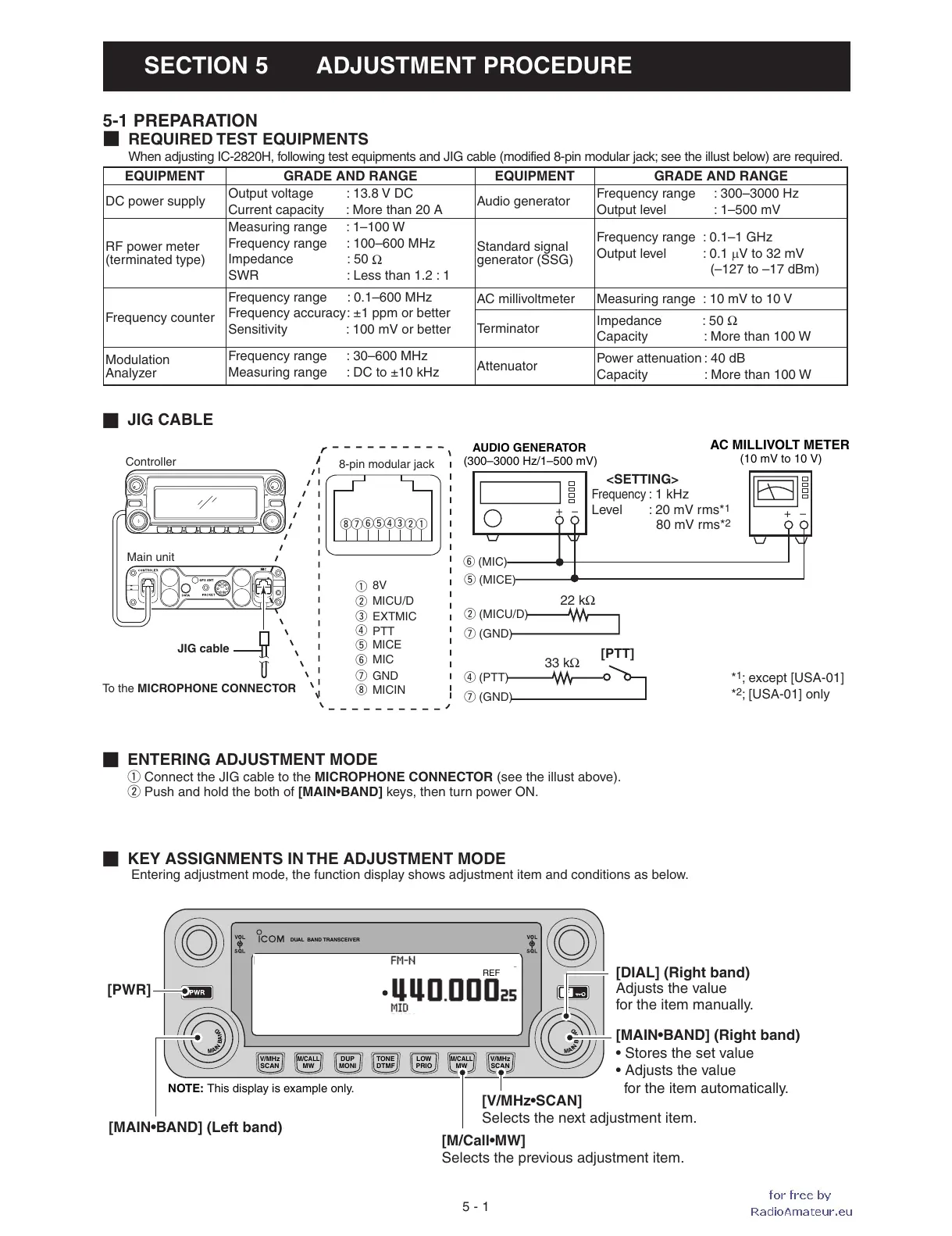 When adjusting IC-2820H, following test equipments and JIG cable (modified 8-pin modular jack; see the illust below) are required.