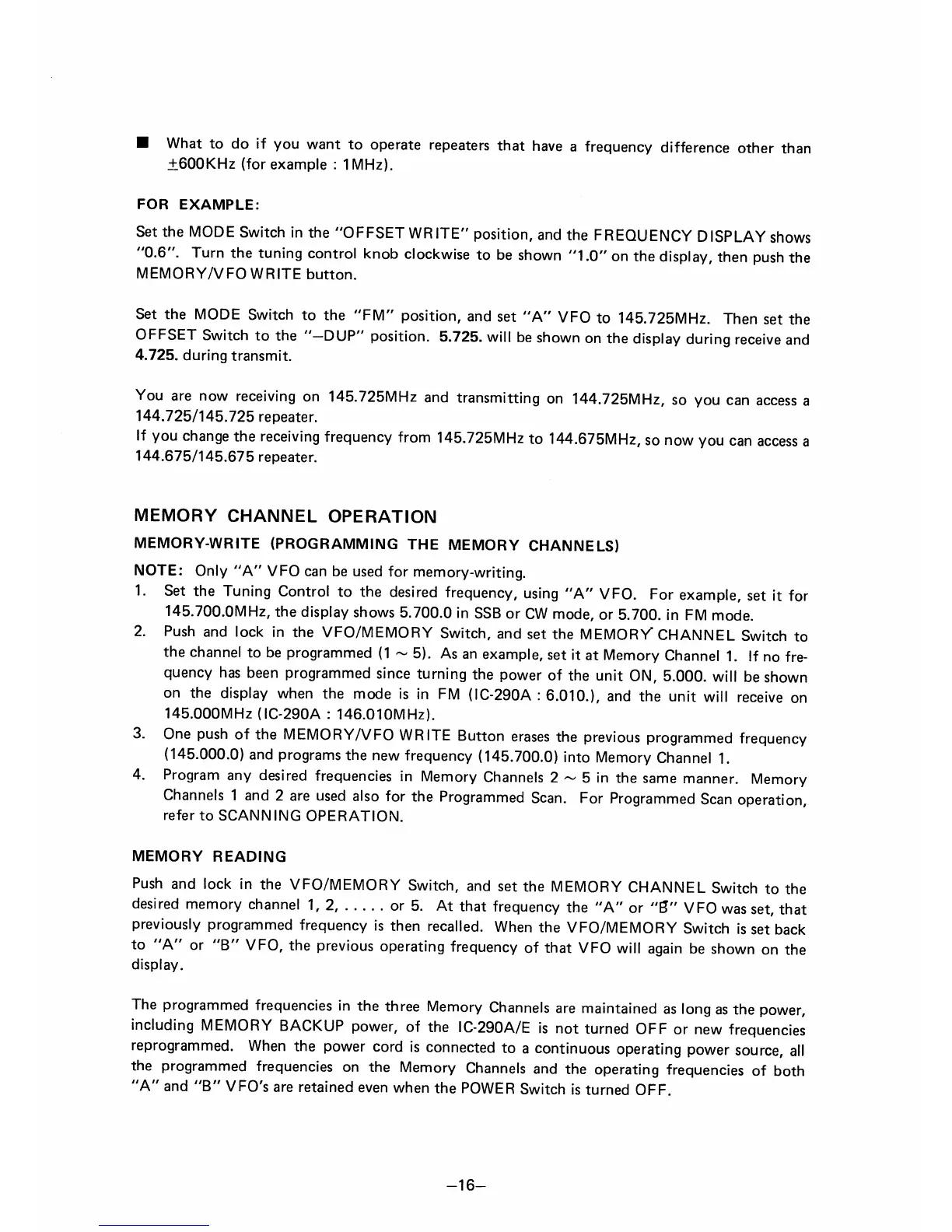 Icom IC-290E - Memory Channel Operation; Memory-Write (Programming Memory Channels); Memory Reading