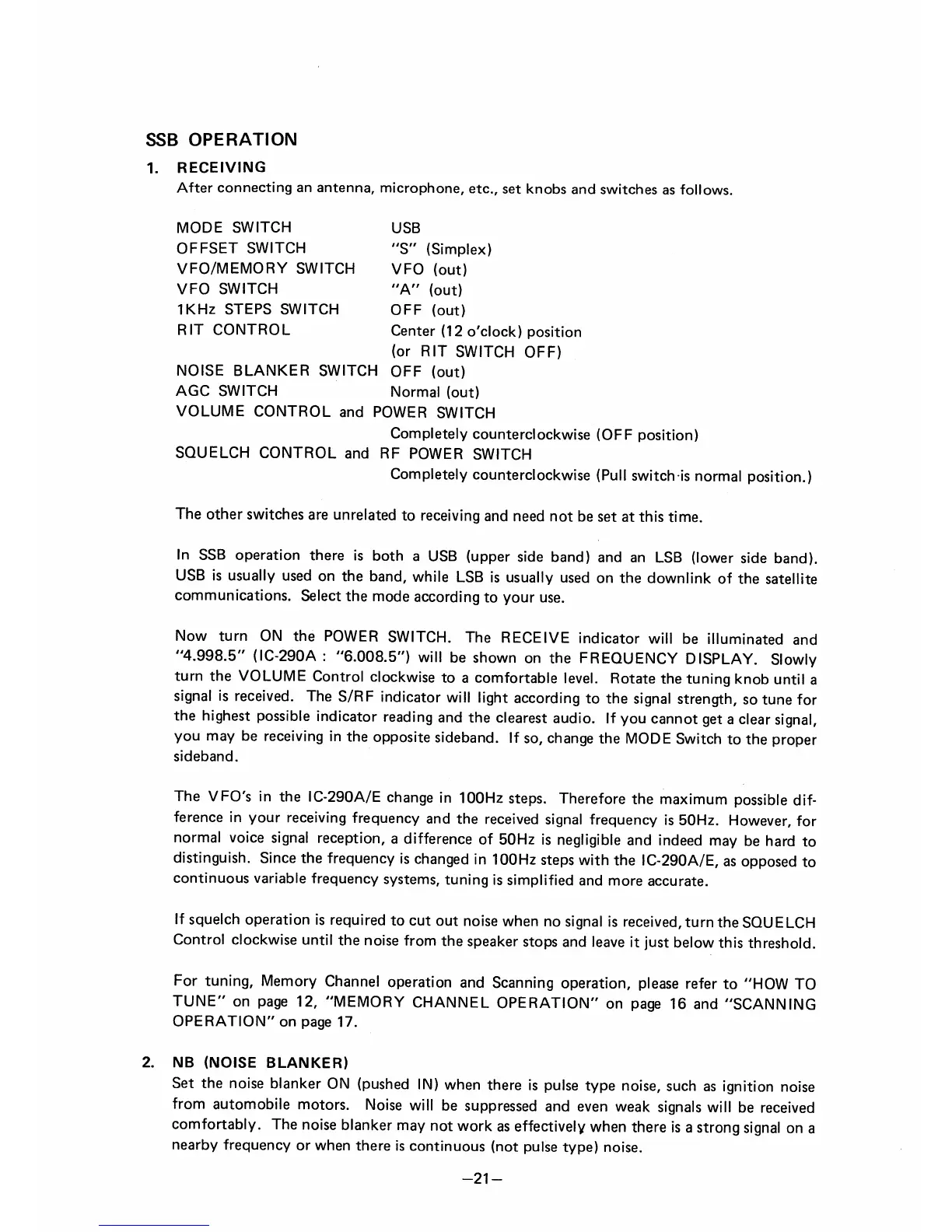Icom IC-290E - SSB Operation; SSB Receiving Setup; Noise Blanker Function