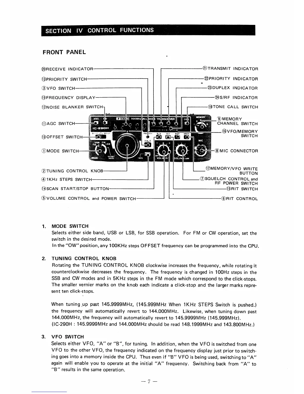 Icom IC-290H/D - SECTION IV CONTROL FUNCTIONS; FRONT PANEL LAYOUT AND BASIC CONTROLS