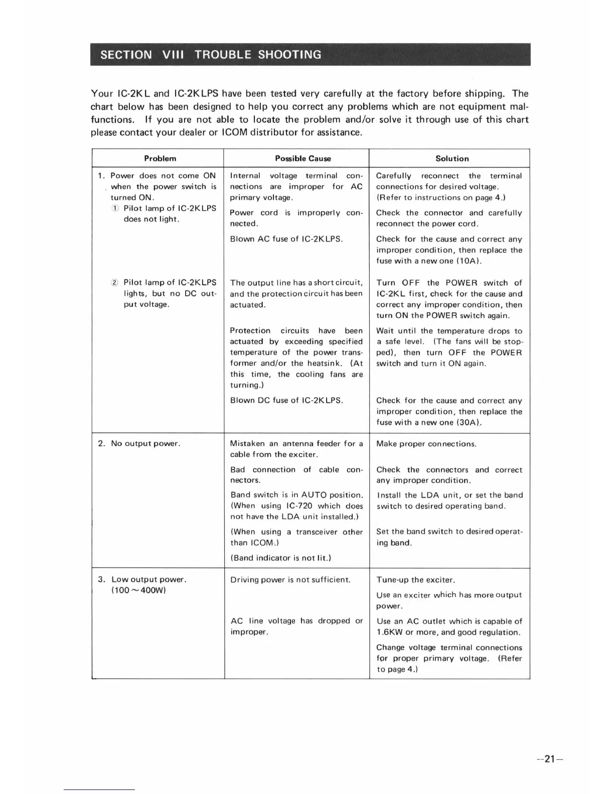 Icom IC-2KL - SECTION VIII TROUBLE SHOOTING; Common Troubleshooting Scenarios