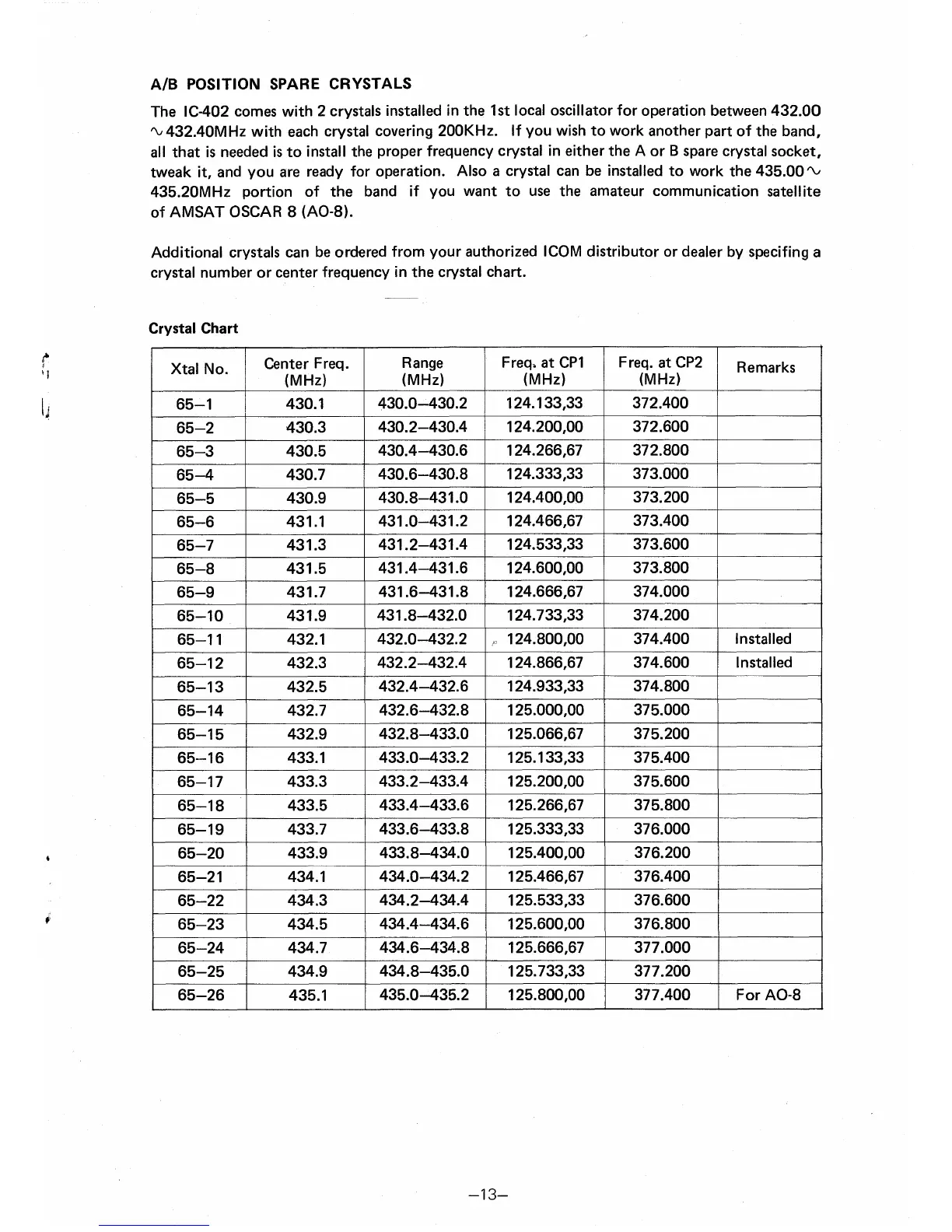 Icom IC-402 - SPARE CRYSTALS AND FREQUENCY ADJUSTMENT; SPARE CRYSTALS