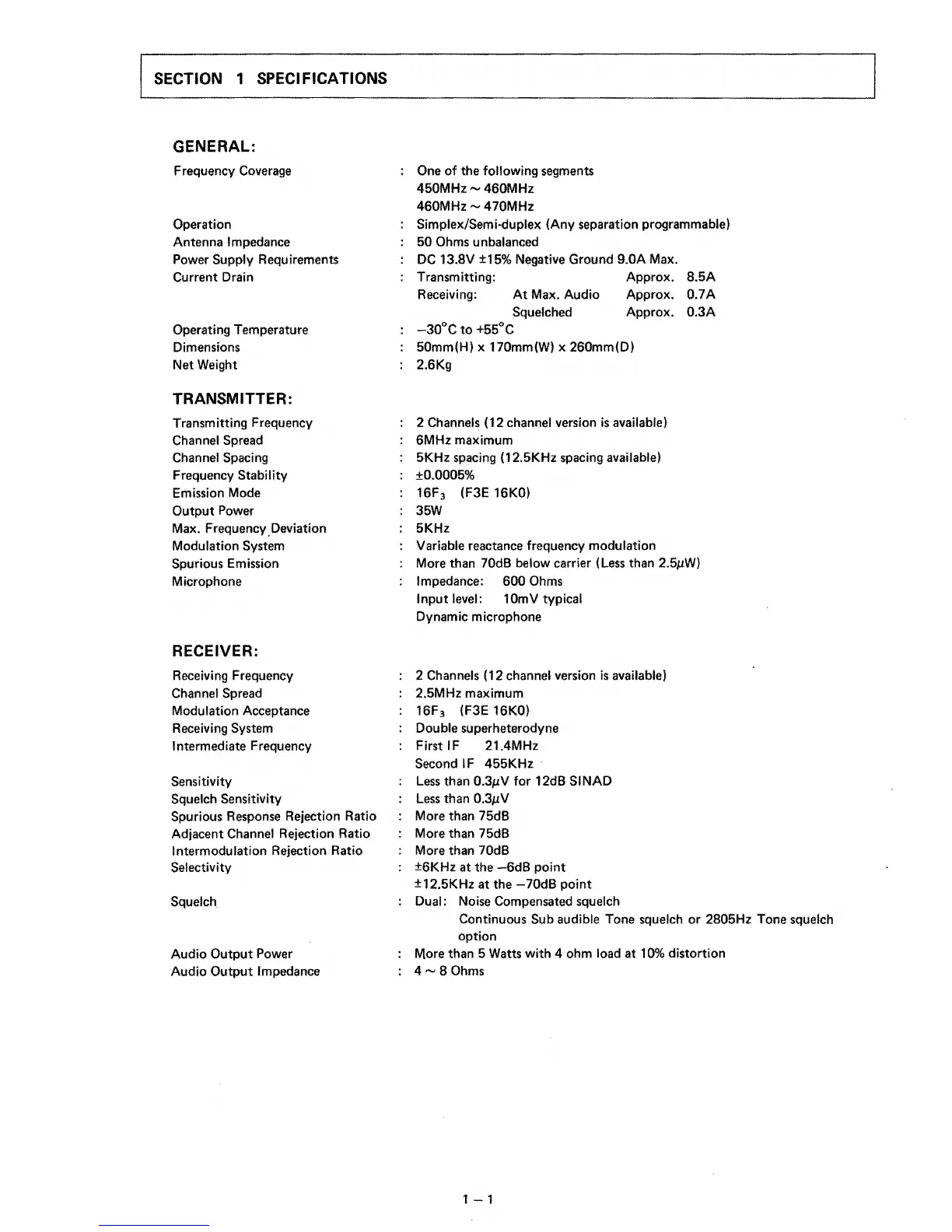 Icom IC-435 - Section 1 Specifications; General Specifications; Transmitter Specifications; Receiver Specifications