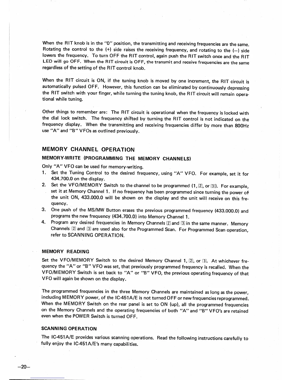 Icom IC-451A - Memory Channel Operation; Memory-Write; Memory Reading; Scanning Opreation