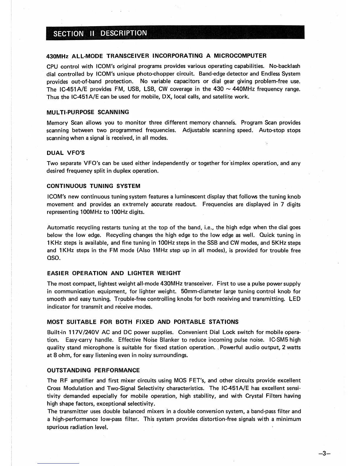 Icom IC-451A - Description; Multi-Purpose Scanning; Dual Vfos; Continuous Tuning System