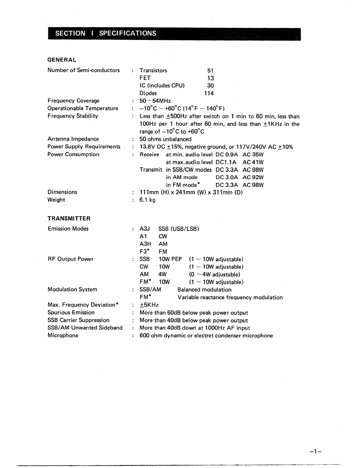 Icom IC-551 - Section I Specifications; General Specifications; Transmitter Specifications
