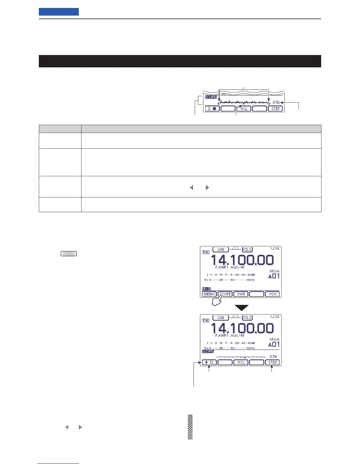 While the band scope is sweeping, “” is displayed; while stopped, “” is displayed.