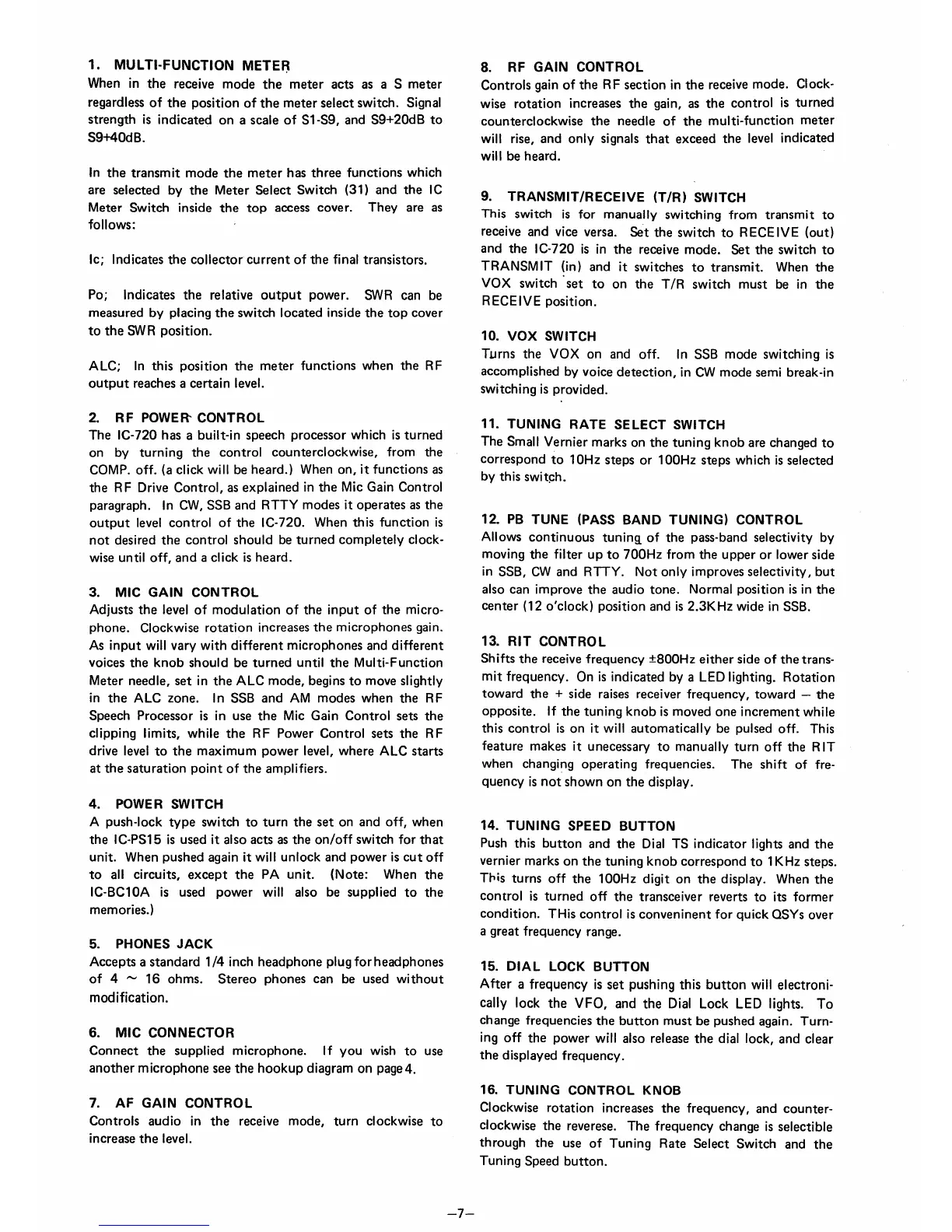 Icom IC-720 - Multi-Function Meter; RF Power Control; MIC Gain Control; Power Switch