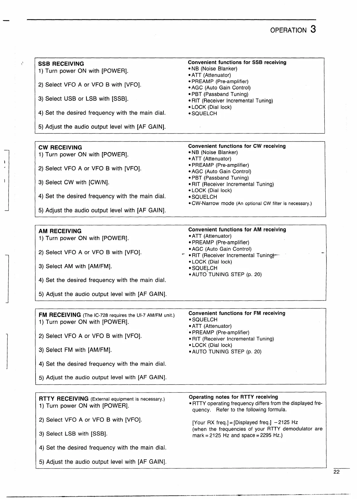 Icom IC-728 - SSB Receiving; CW Receiving; AM Receiving; FM Receiving