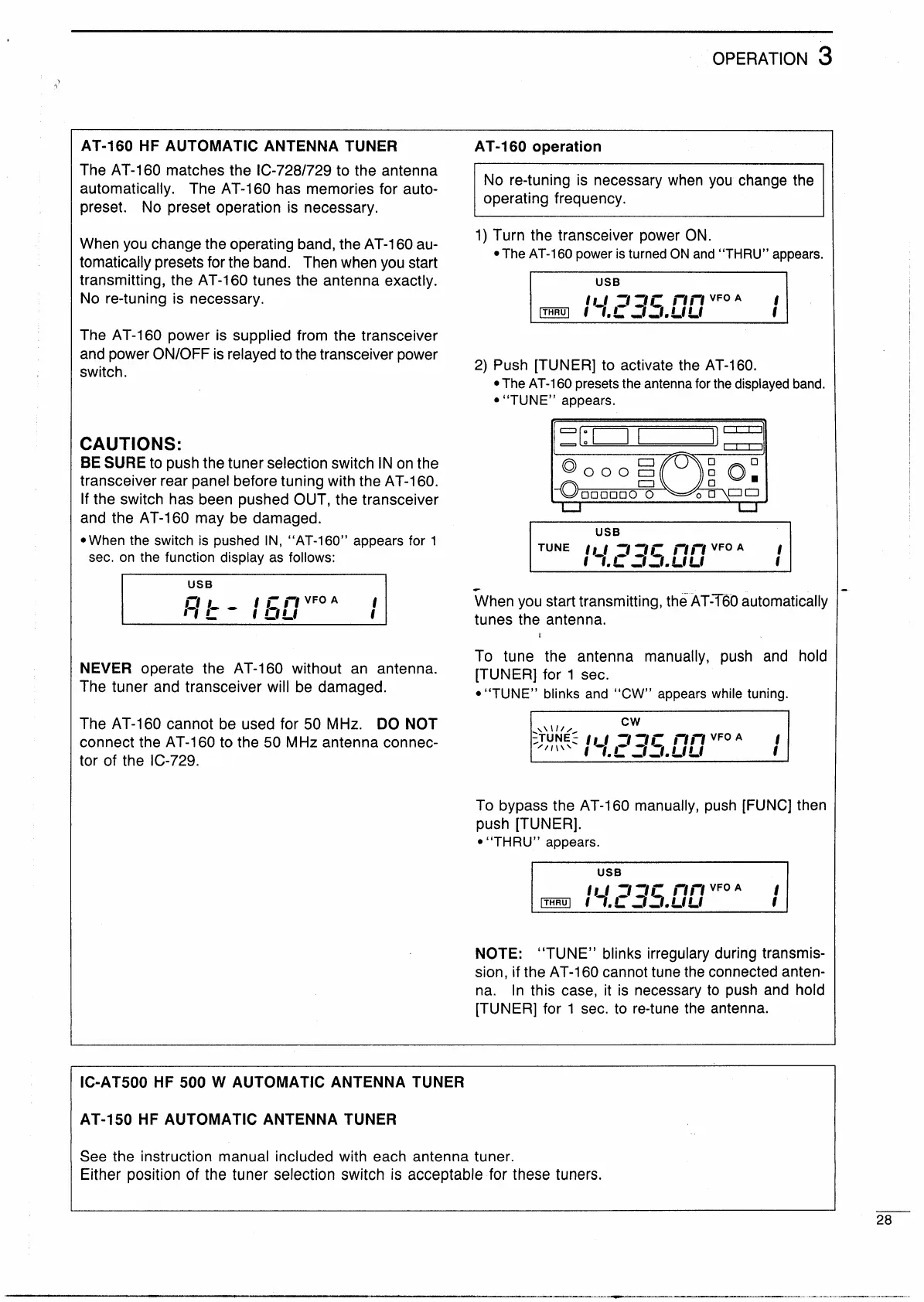 Icom IC-728 - AT-160 HF Automatic Antenna Tuner; AT-160 Operation