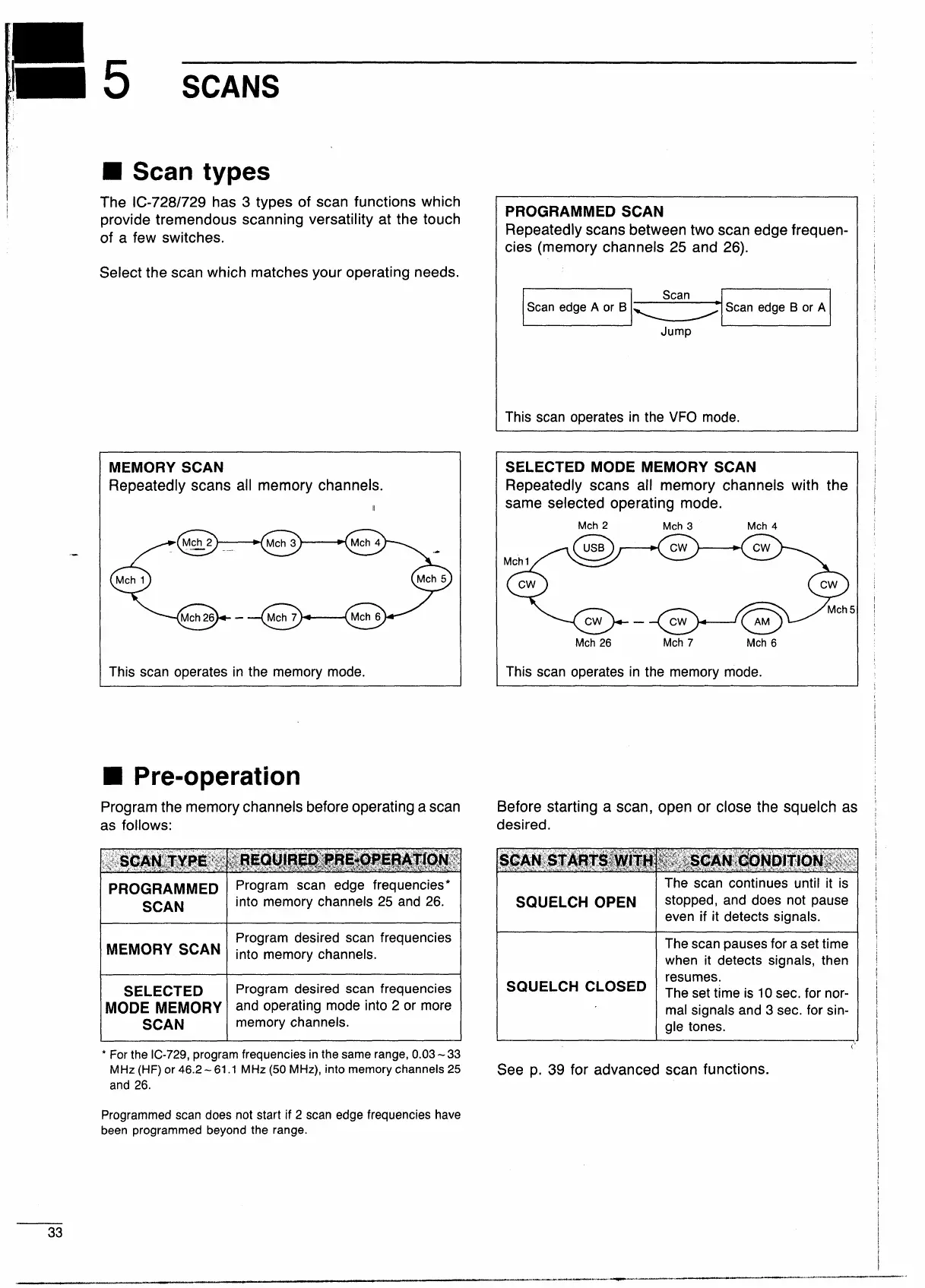 Icom IC-728 - Scans; Scan Types; Pre-Operation; Memory Scan