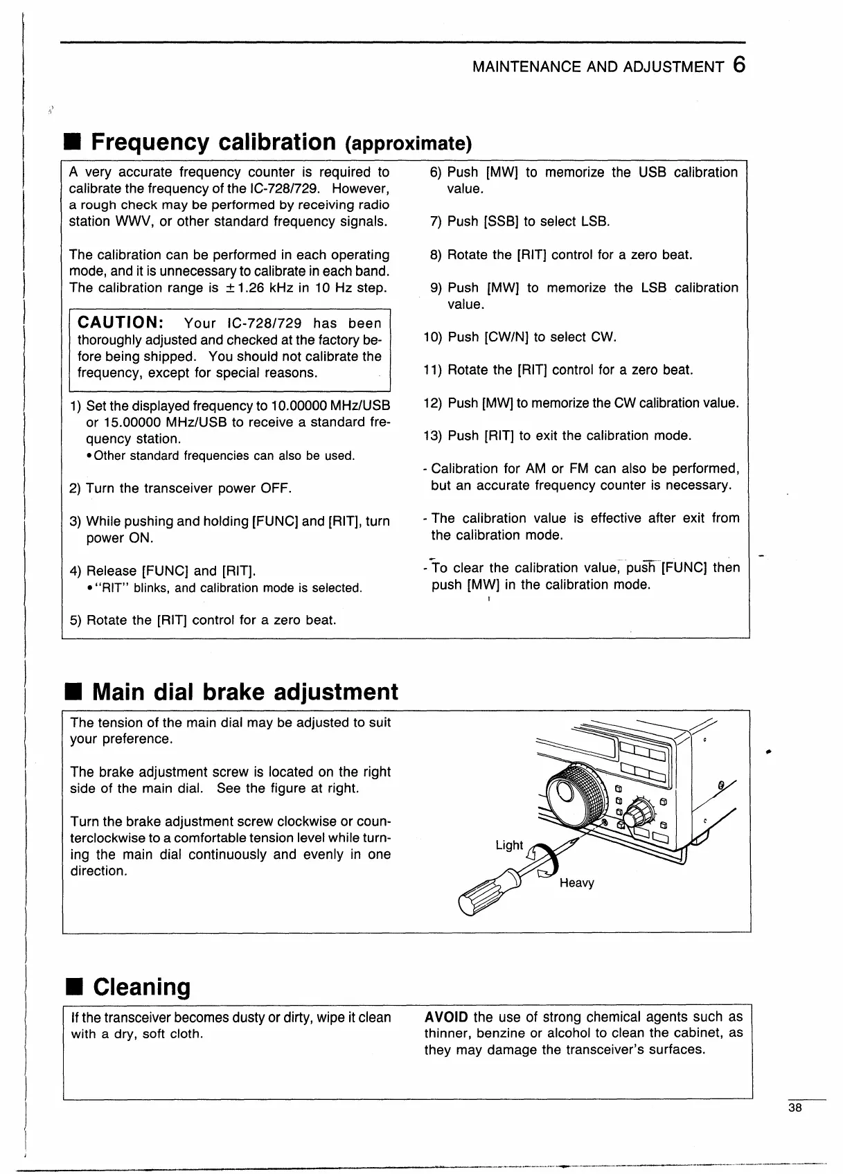 Icom IC-728 - Frequency Calibration; Main Dial Brake Adjustment; Cleaning