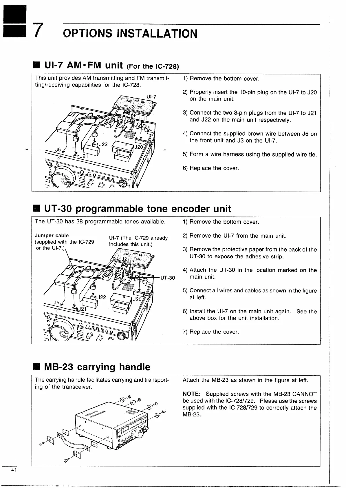 Icom IC-728 - Options Installation; UI-7 AMFM Unit; UT-30 Programmable Tone Encoder Unit; MB-23 Carrying Handle