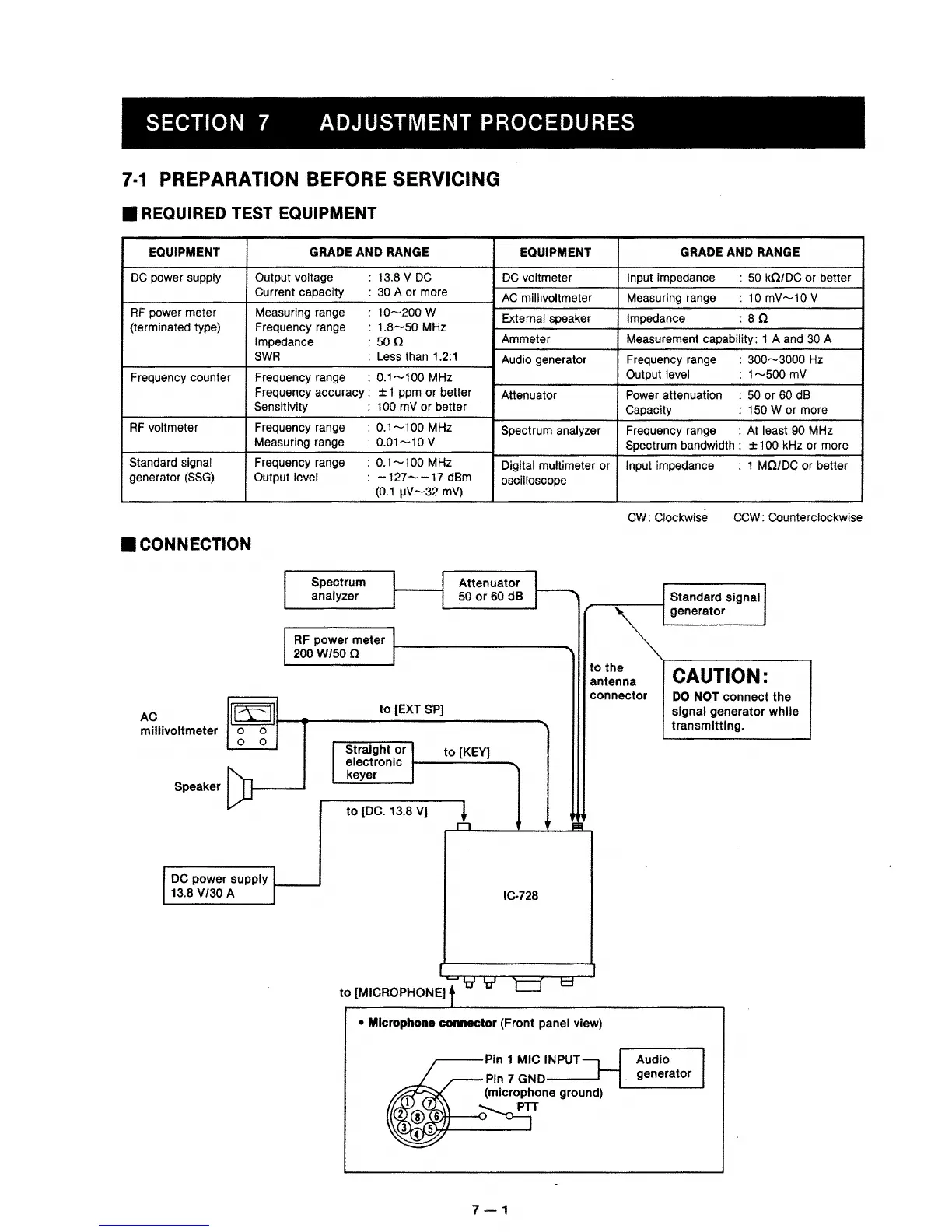 Icom IC-728 - Section 7: IC-728 Service Adjustment Procedures; Servicing Preparation and Test Equipment