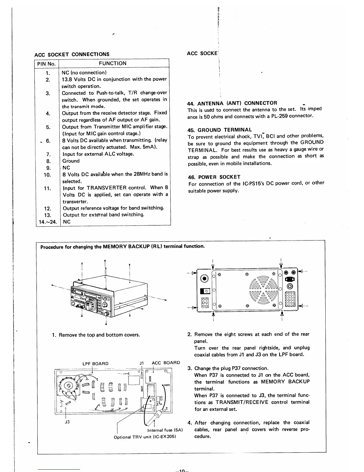 Icom IC-730 - ACC Socket Connections; Changing the Memory Backup (RL) Terminal Function