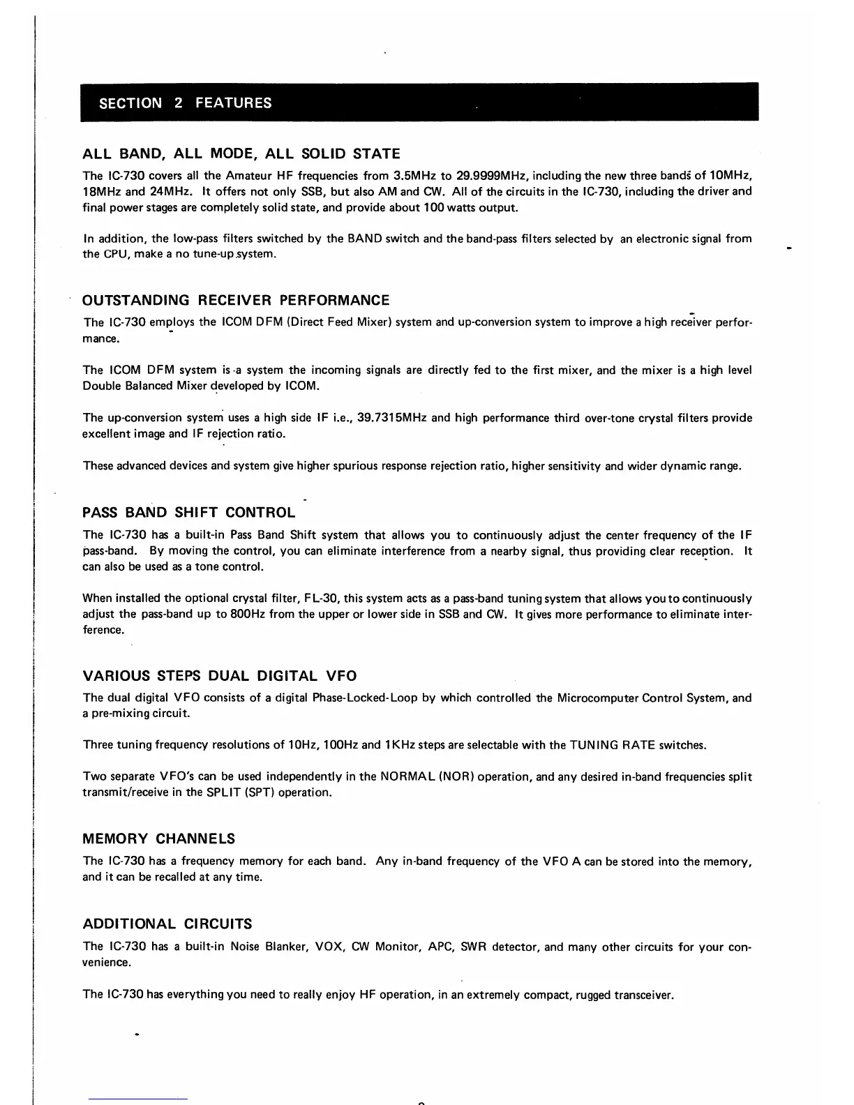 Icom IC-730 - ICOM IC-730 Features; ALL BAND, ALL MODE, SOLID STATE DESIGN; ADVANCED RECEIVER PERFORMANCE; PASS BAND SHIFT CONTROL SYSTEM