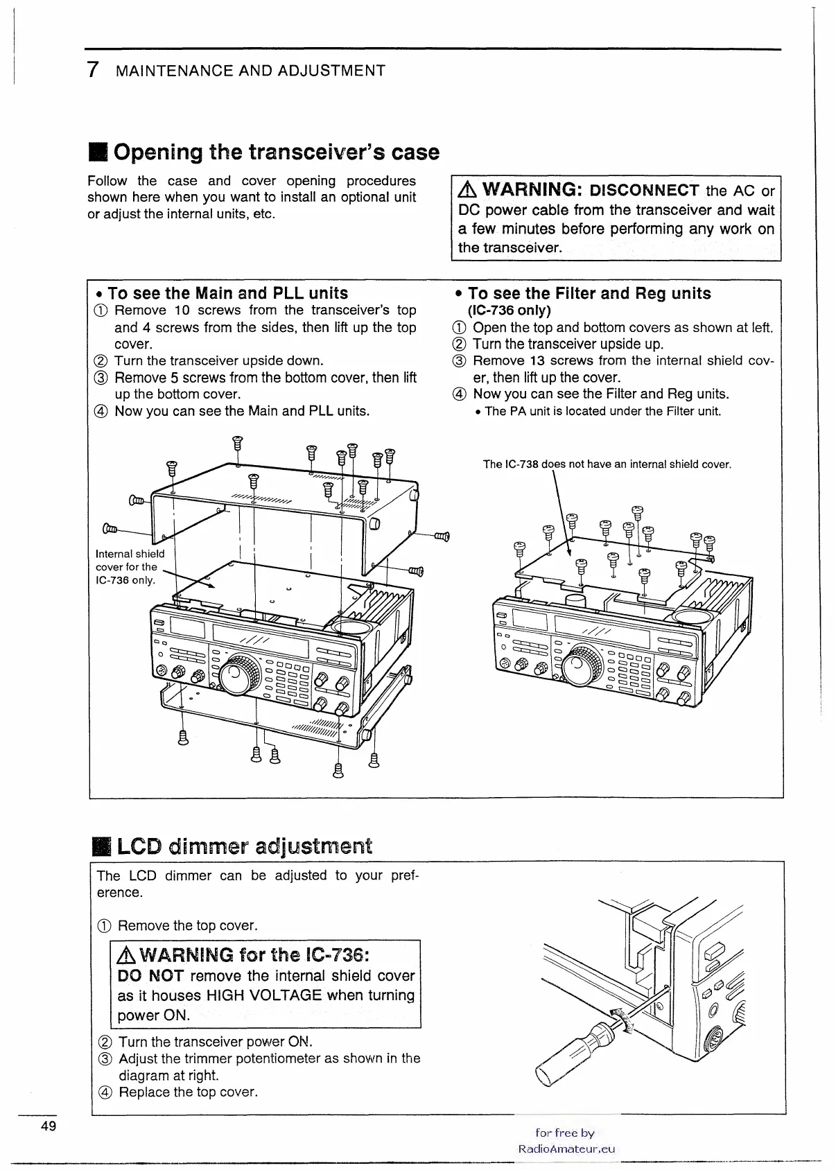 Icom IC-738 - Opening the Transceivers Case; LCD Dimmer Adjustment; To See the Main and PLL Units