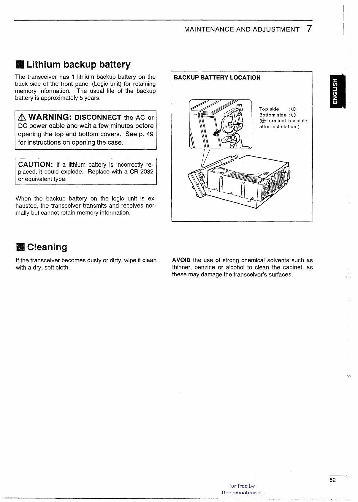 Icom IC-738 - Lithium Backup Battery; Cleaning; Battery Location
