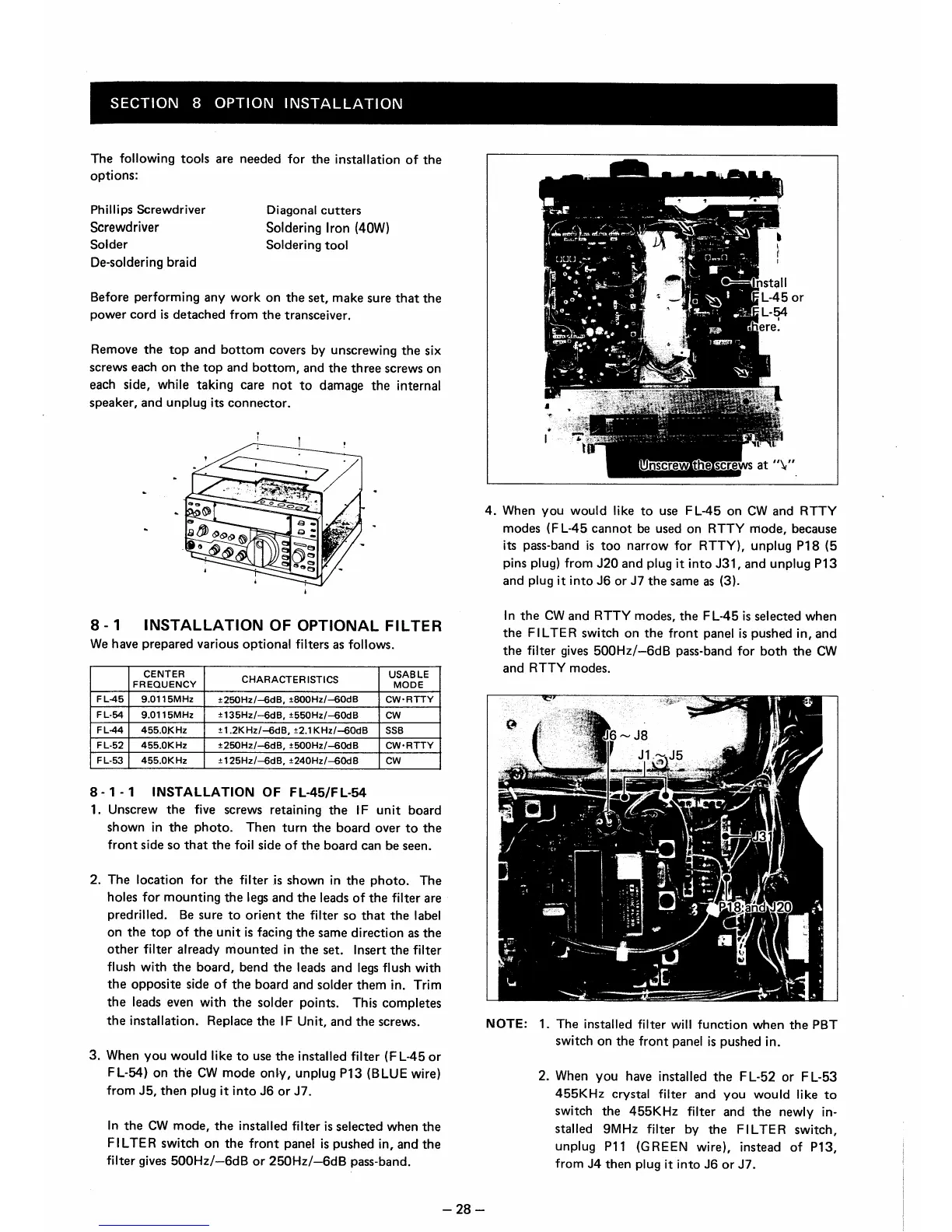 Icom IC-740 - Option Installation; Installation of Optional Filter; Installation of FL-45 FL-54