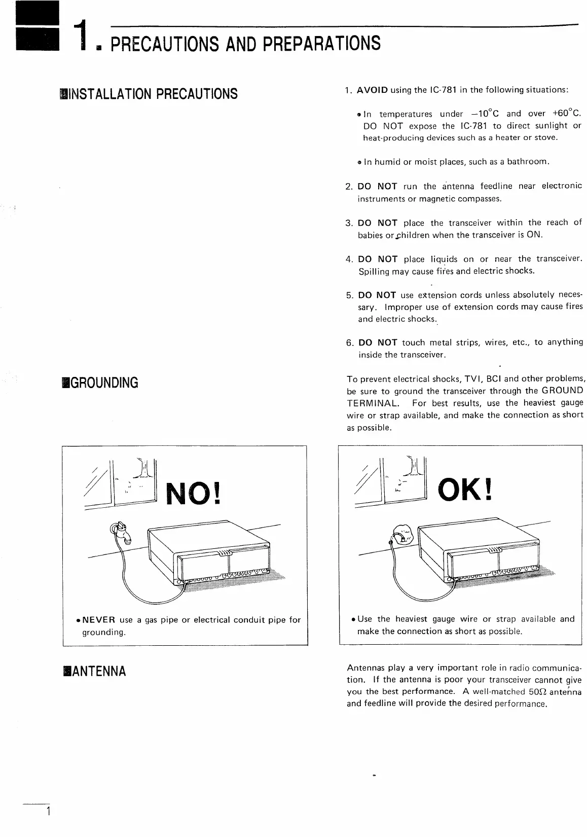 Icom IC-781 - Precautions and Preparations; Installation Precautions; Grounding Guidelines; Antenna Considerations