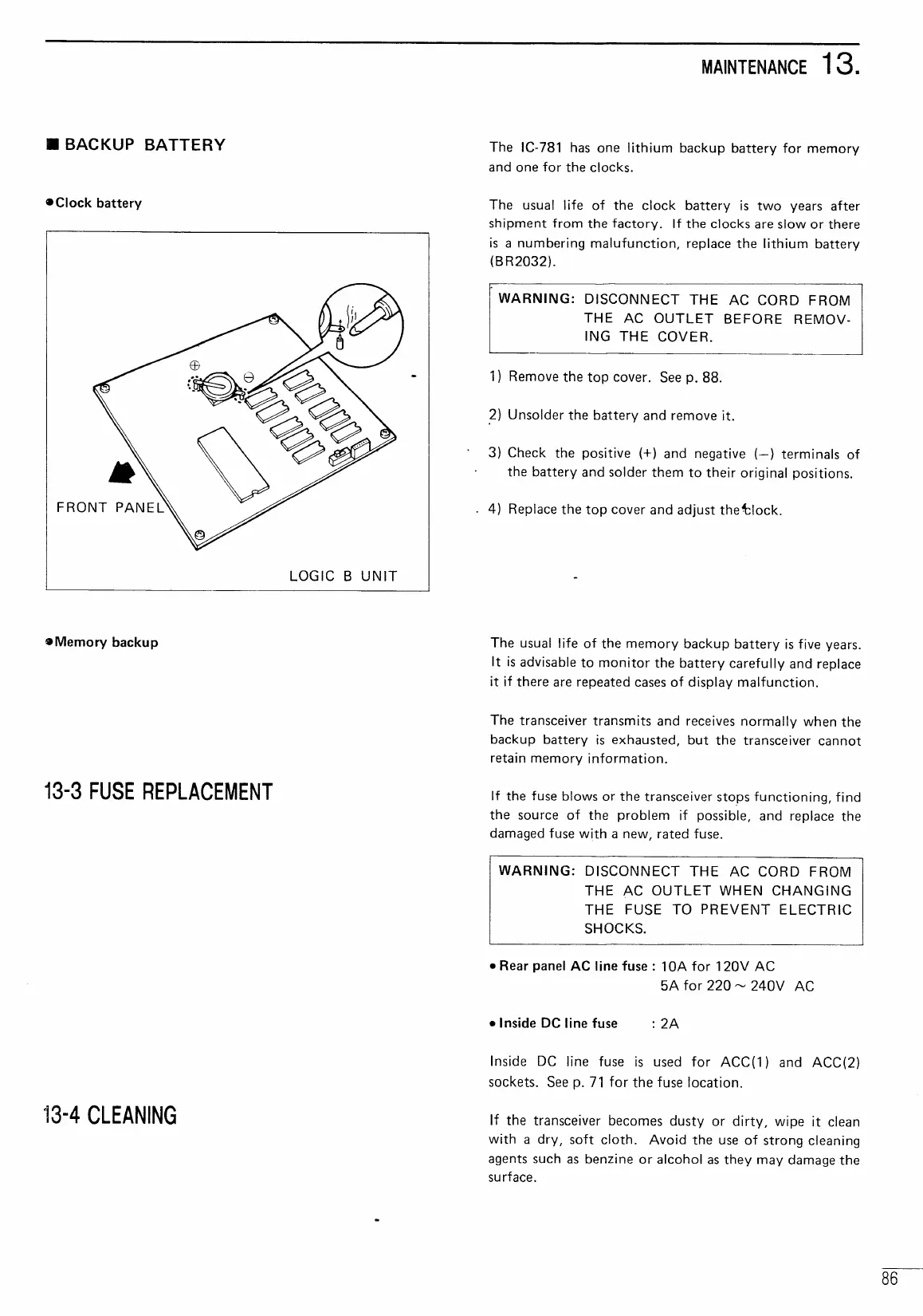 Icom IC-781 - Backup Battery Replacement; Fuse Replacement Guide
