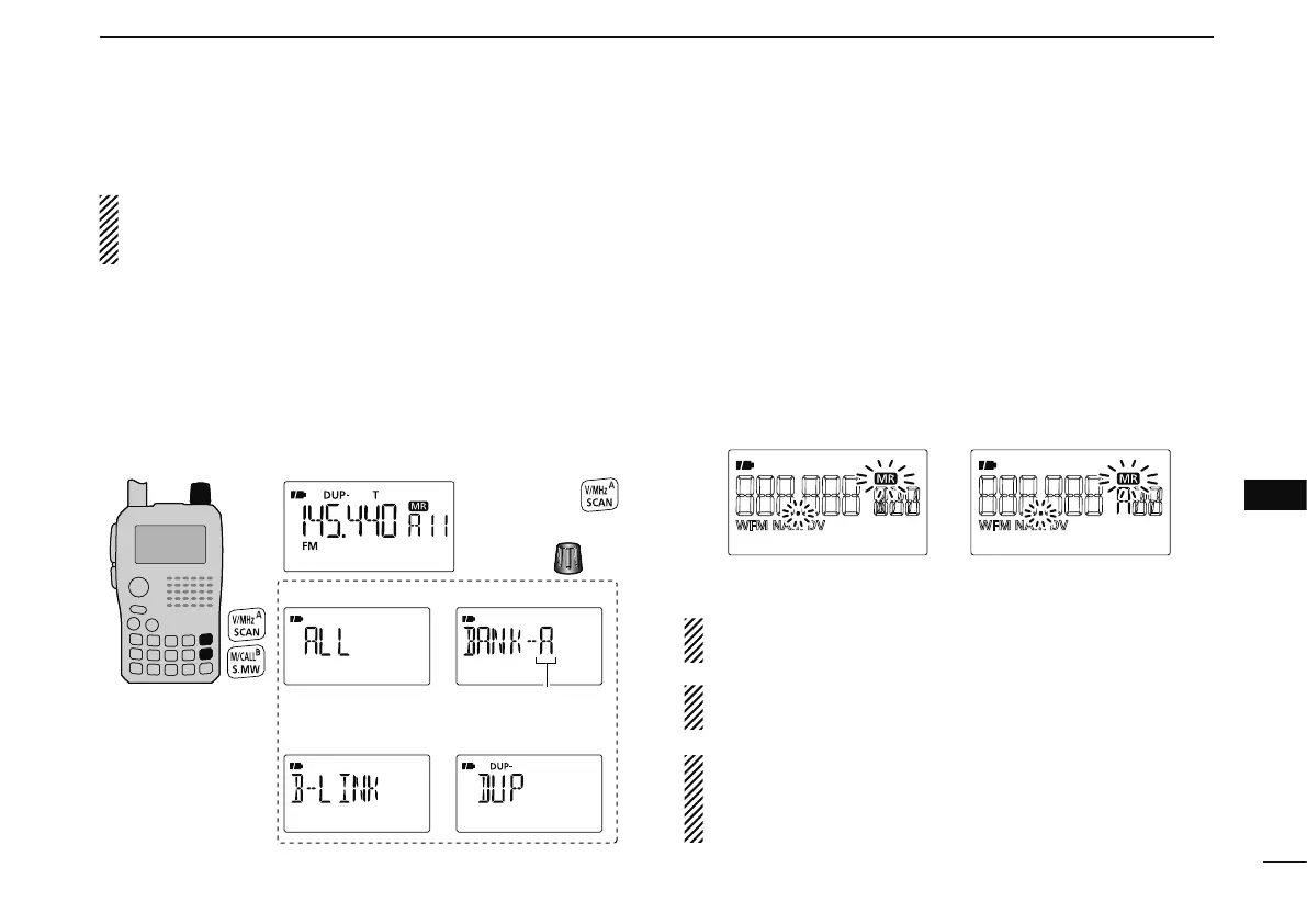 e Push and hold [SCAN](V/MHz) for 1 sec. to enter the scan-