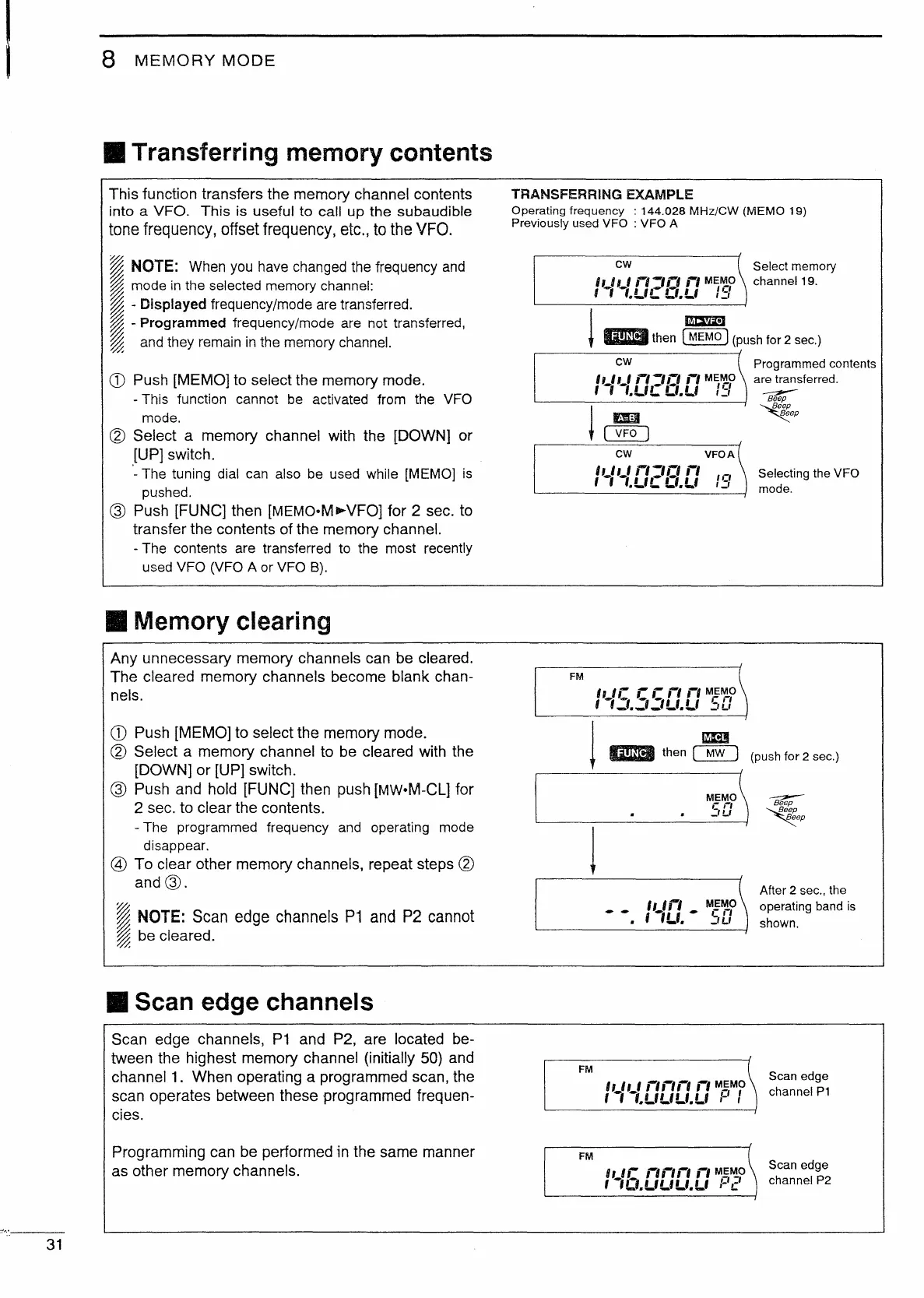 Icom IC-820H - Memory Content Transfer and Clearing; Transferring Memory Contents to VFO; Clearing Memory Channels and Scan Edges