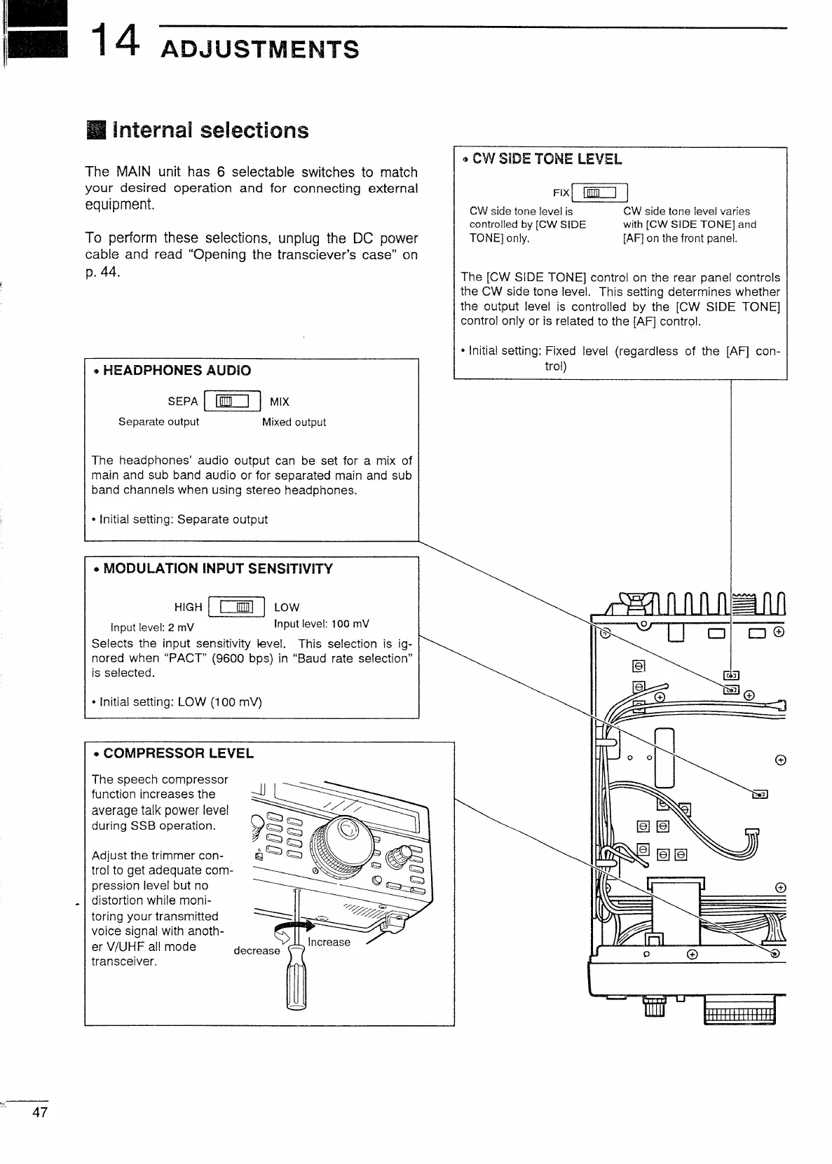 Icom IC-820H - Internal Adjustments and Selections; Internal Selections: CW Tone and Headphones; Internal Selections: Modulation and Compressor