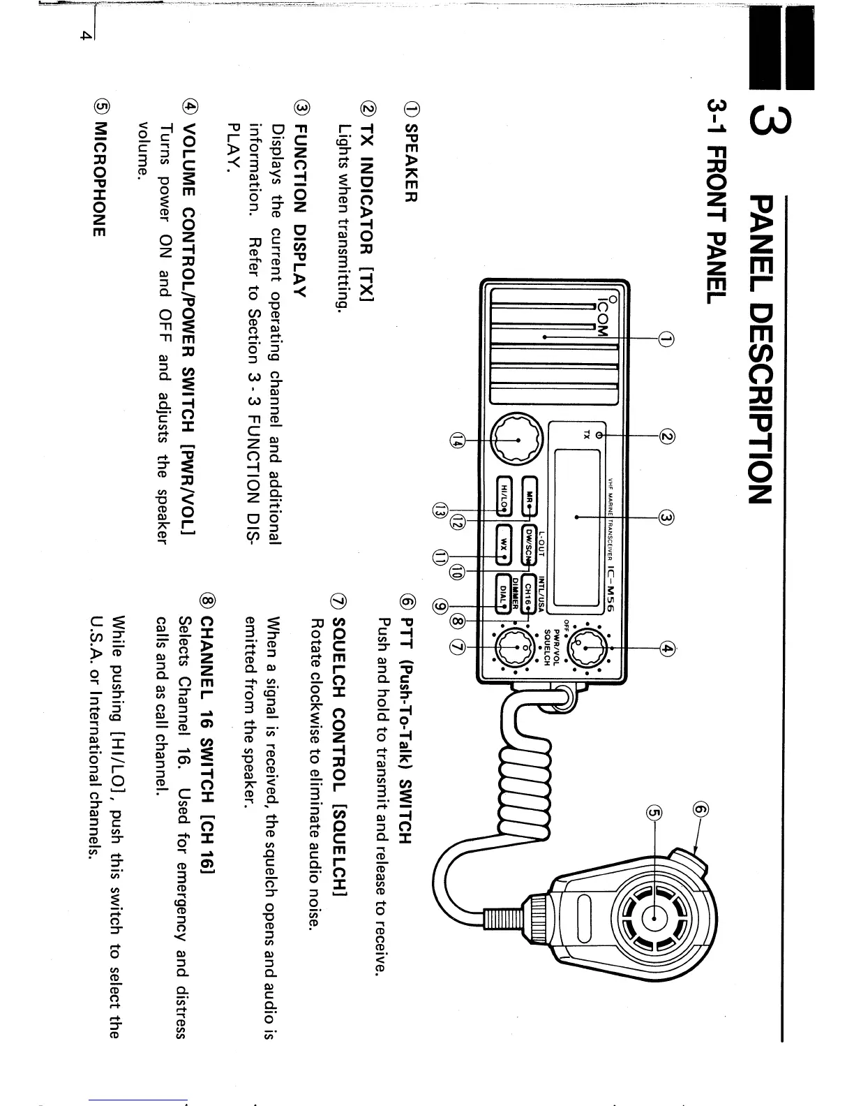 Icom IC-M56 - Panel Description: Front Panel; Front Panel Controls and Indicators