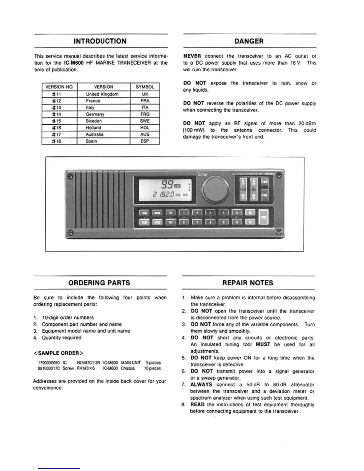 Icom IC-M600 - Introduction; DANGER Warnings
