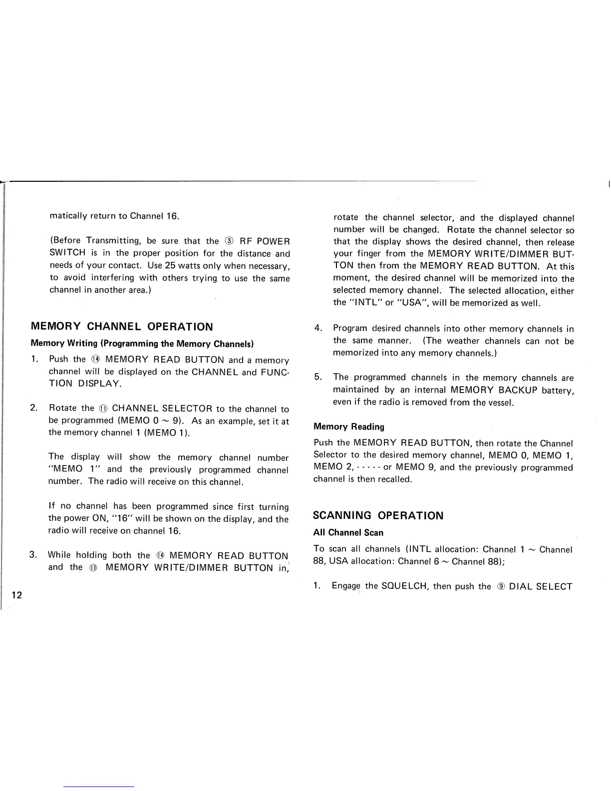 Icom IC-M80 - Transmitting Procedures (Continued); Memory Channel Programming; Memory Channel Recall; All Channel Scanning