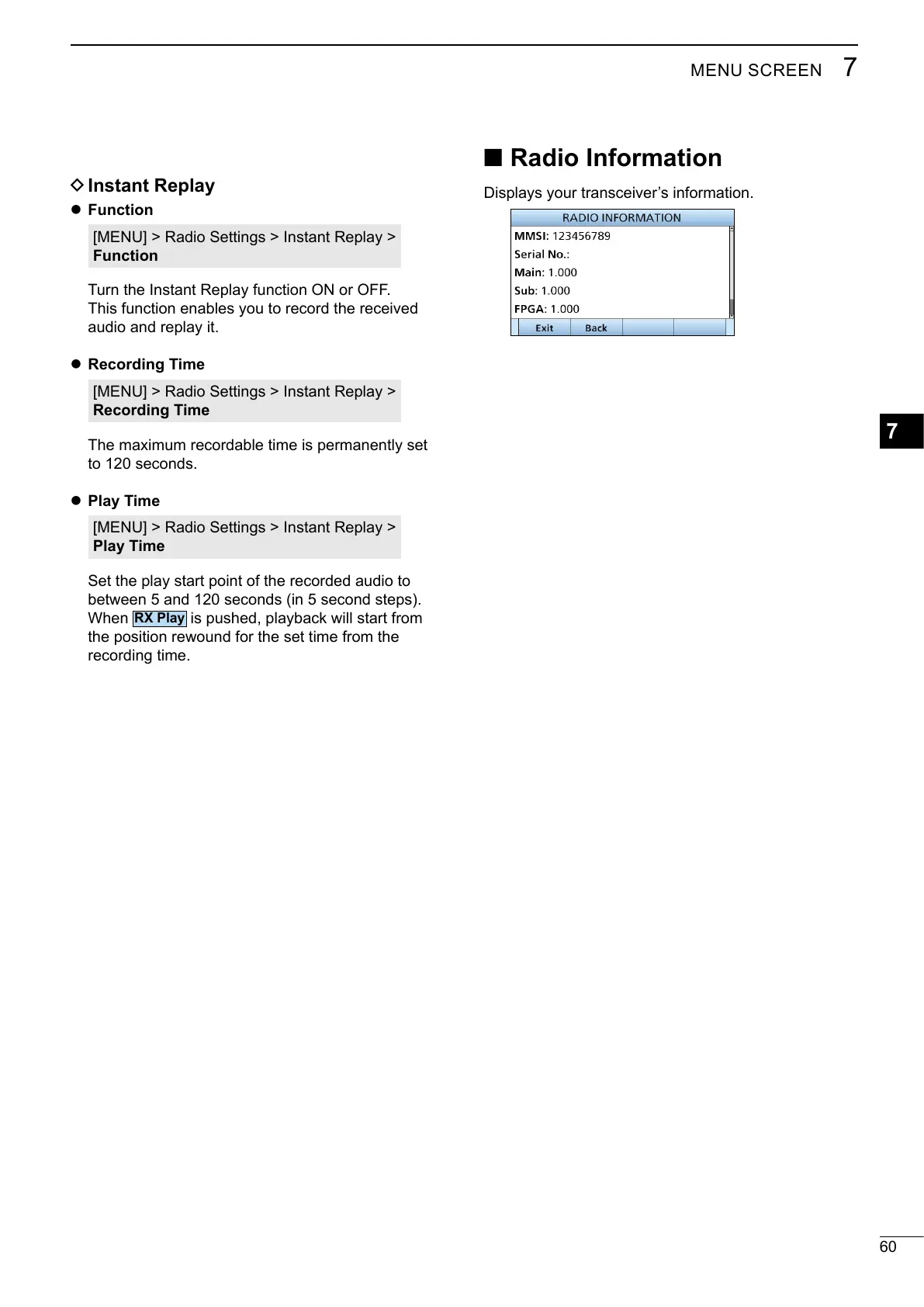 Displays your transceiver’s information.